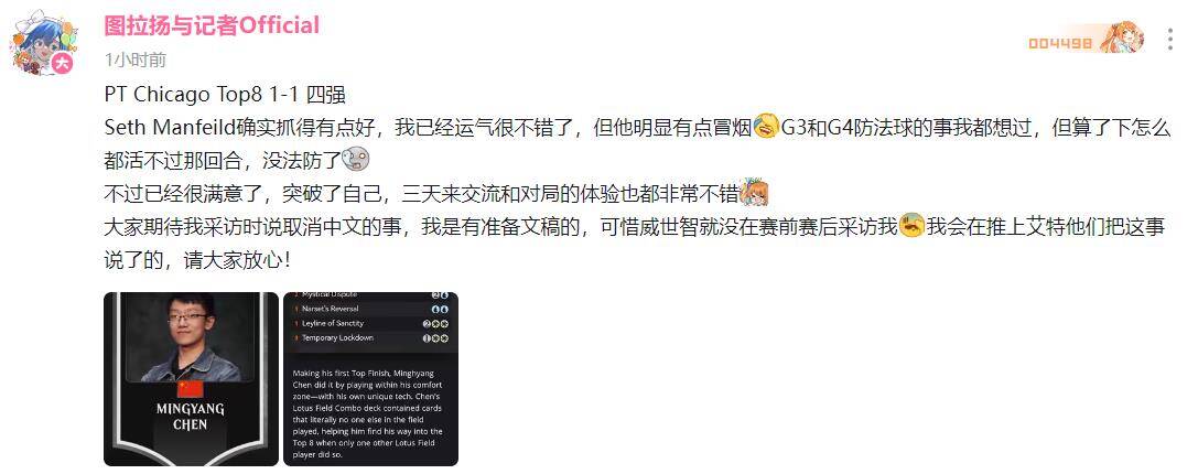 中国牌手陈鸣阳@图拉扬与记者Official 进入4强,祝愿他今后取得更好的成绩。