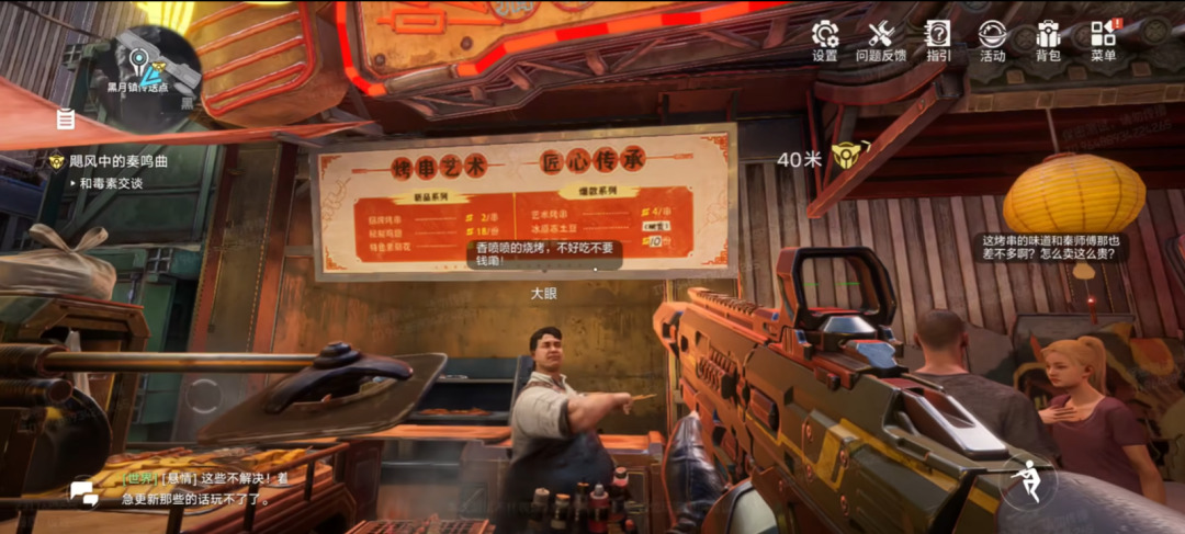 在聚集点,你甚至还有机会见到现实中街边常见的烤串店,NPC “ 大眼 ” 还在招呼着 “ 香喷喷的烧烤,不好吃不要钱 ” ,烟火气与科幻味在此交界,这才叫中式科幻。