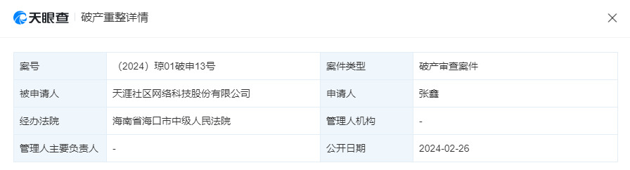 快科技2月27日消息,据天眼查显示,天涯社区网络科技股份有限公司新增一则破产审查案件,办理法院为海南省海口市中级人民法院,申请人为张鑫。
