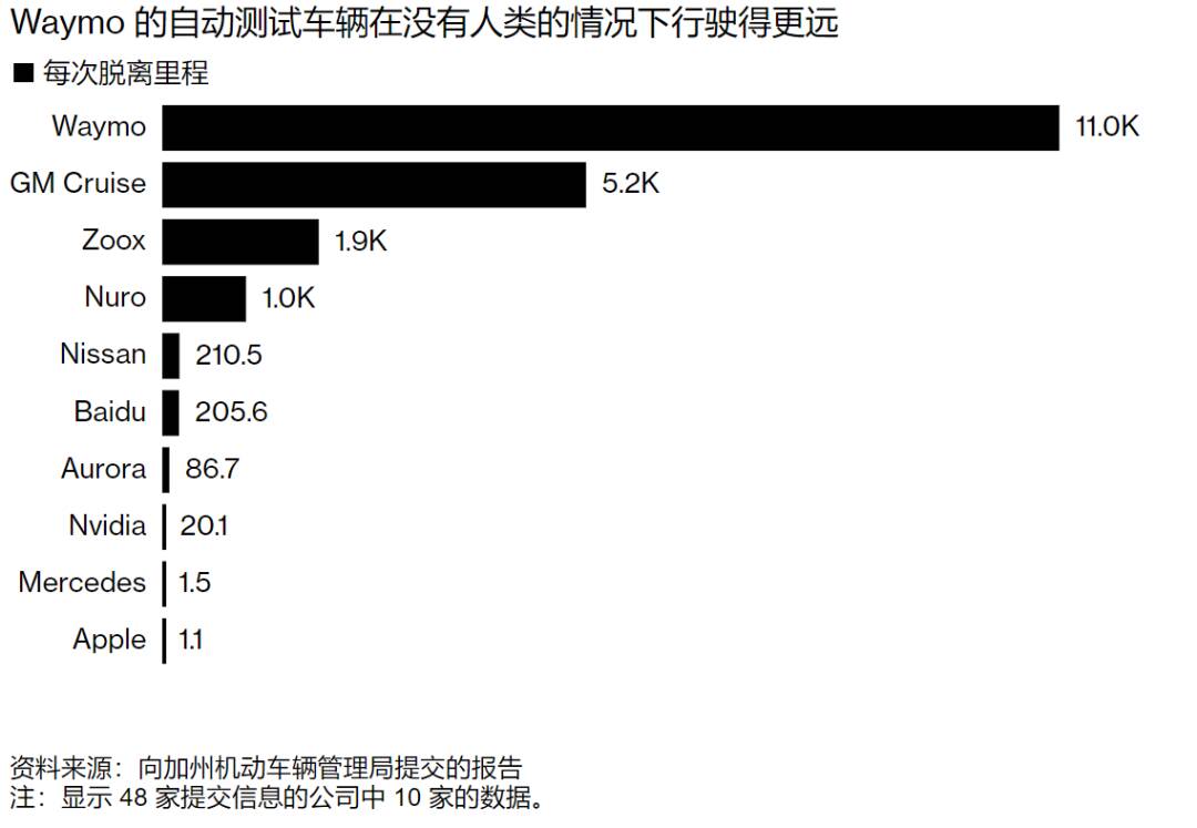 有个衡量自动驾驶好不好用的指标,是一台车在不需要人们干预的情况下能开多远。那时候,主流的几个自动驾驶公司,像 Waymo 和 Cruise ,分别是 1.1 万英里和 5200 英里需要干预一次。