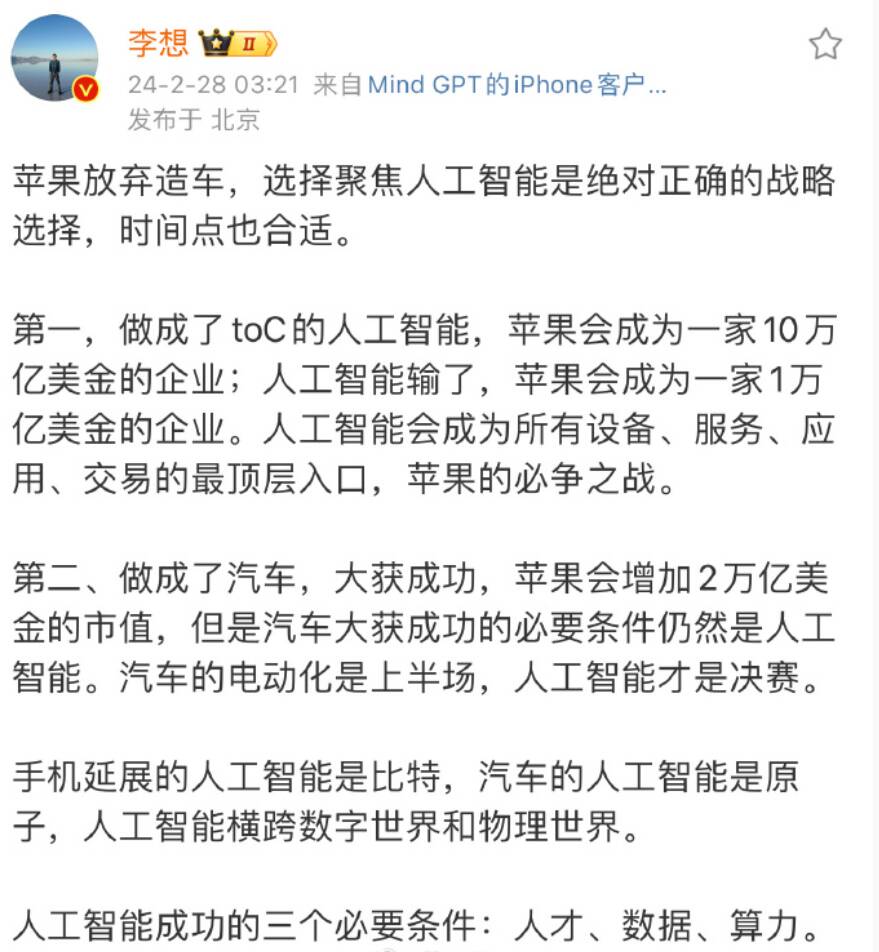 面对这个略显突然的消息,国内的几个车企大佬,像米车的雷军和理想的李想,也是纷纷表达了自己的观点。