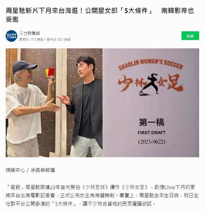 据中时新闻网、Yahoo新闻、三立新闻网等多家台媒报道:周星驰新片《少林女足》将于3月初举行记者会并公布海选机制,周星驰将参与台湾地区的选秀。