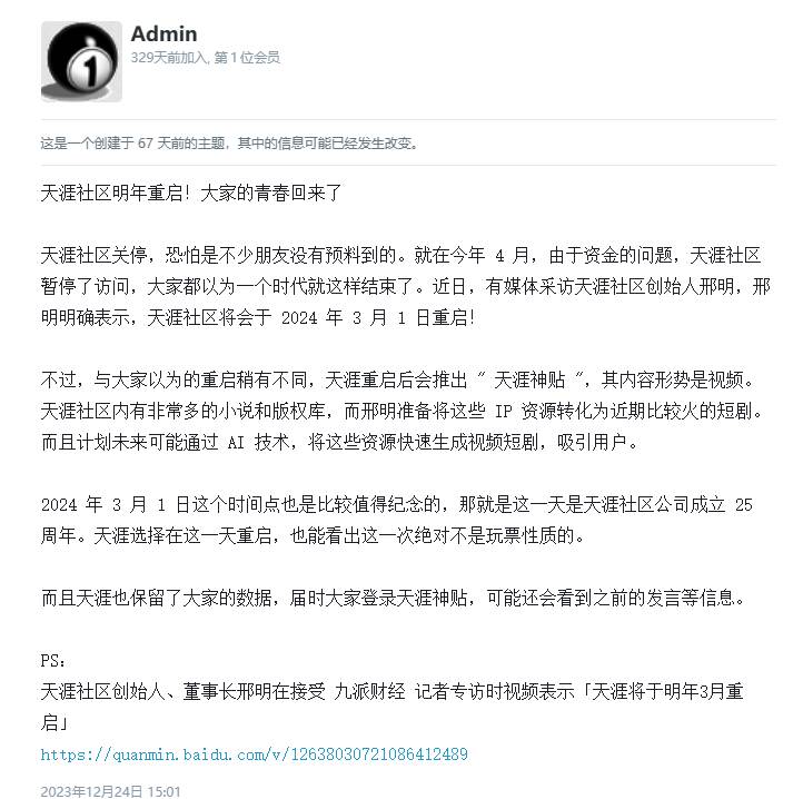 如今,明天就是2024年3月1日了,届时天涯社区还将发布公告,推出新天涯创建计划和时间表。
