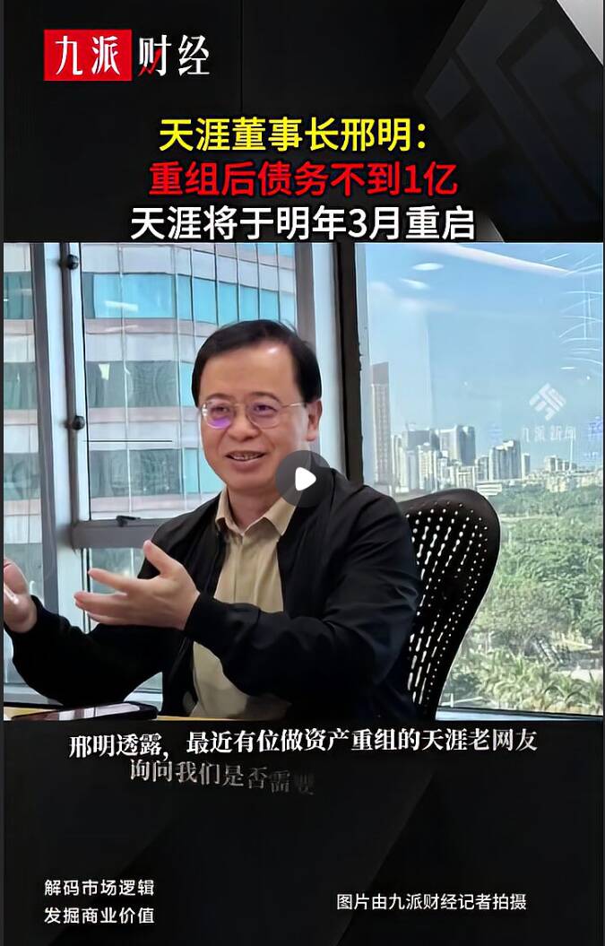 去年年底,天涯社区创始人、董事长邢明接受九派财经记者专访时表示,天涯将于明年(2024年)3月1日重启。