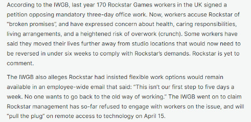 据IWGB报道,去年英国有170名R星的员工签署了一份请愿书,反对强制实行三天办公室工作制,R星也曾在一封面向全体员工的电子邮件中坚称,“灵活的工作方式仍将可用”。但新要求的变化,让一些员工开始指责R星“违背承诺”,并对健康、照顾责任、生活安排和过劳风险增加表示担忧。