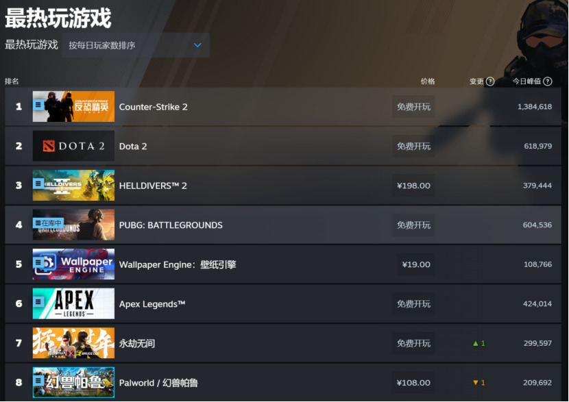 而玩家人数的火爆也说明了一切,如今《地狱潜兵2》的每日玩家人数已经超越了《PUBG》和《Apex》,位居steam最热玩游戏的第三名,仅次于《CSGO2》与《DOTA2》。