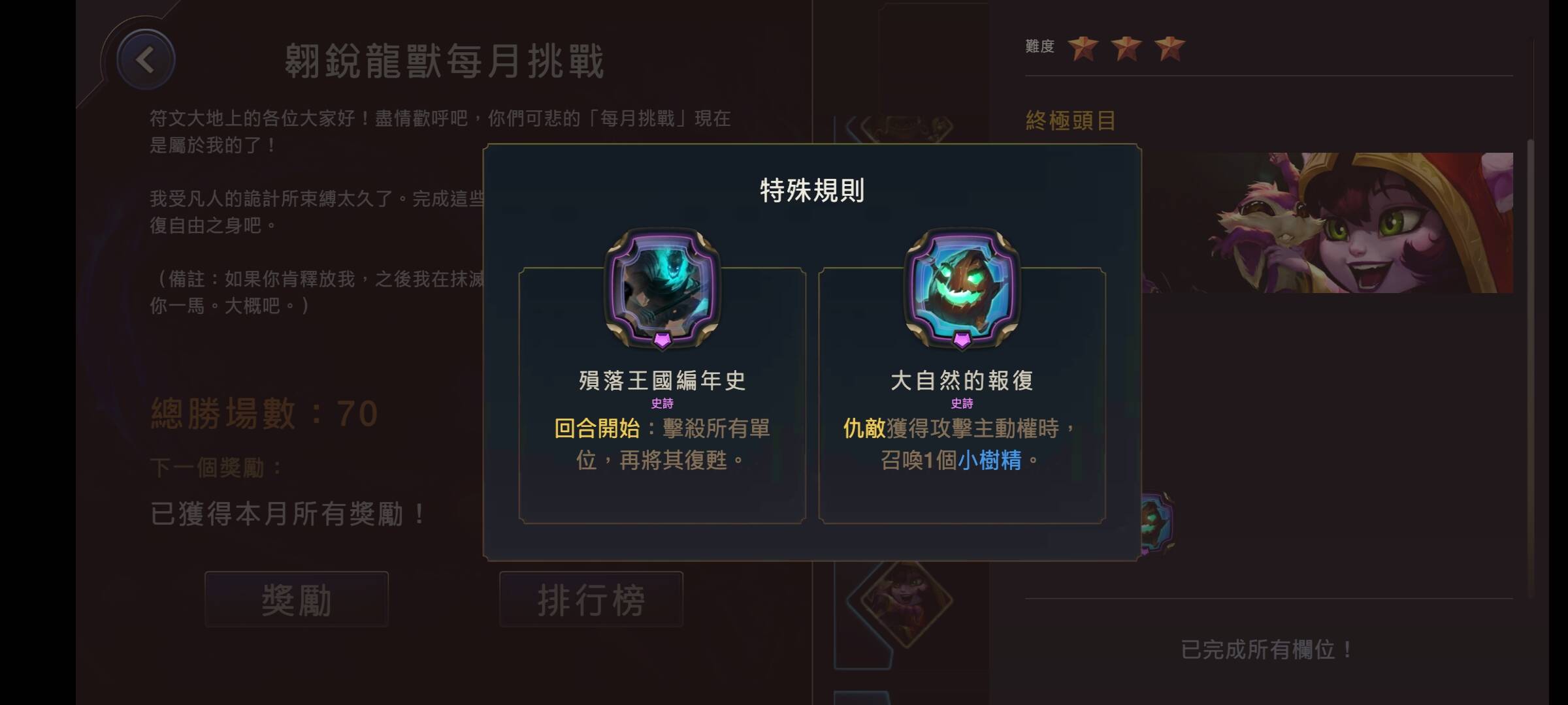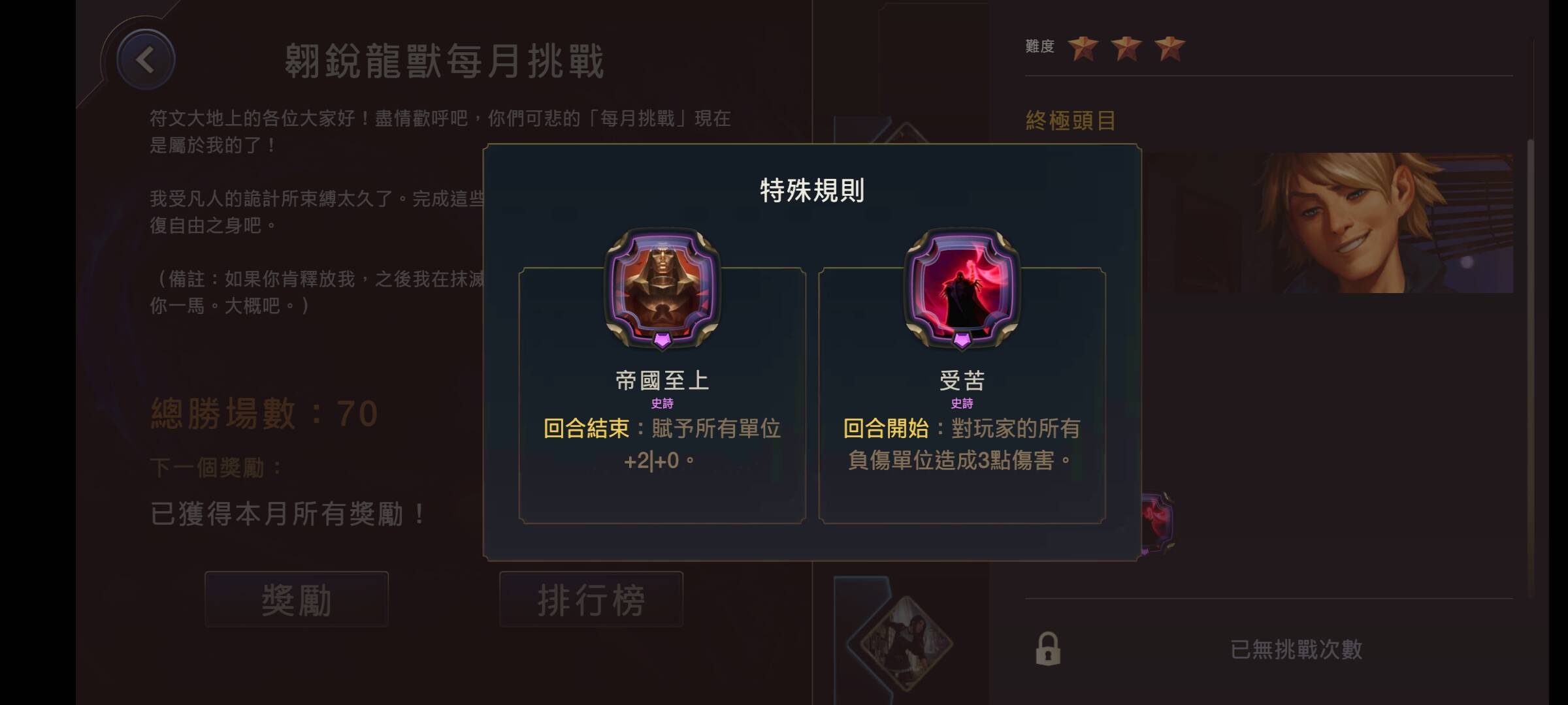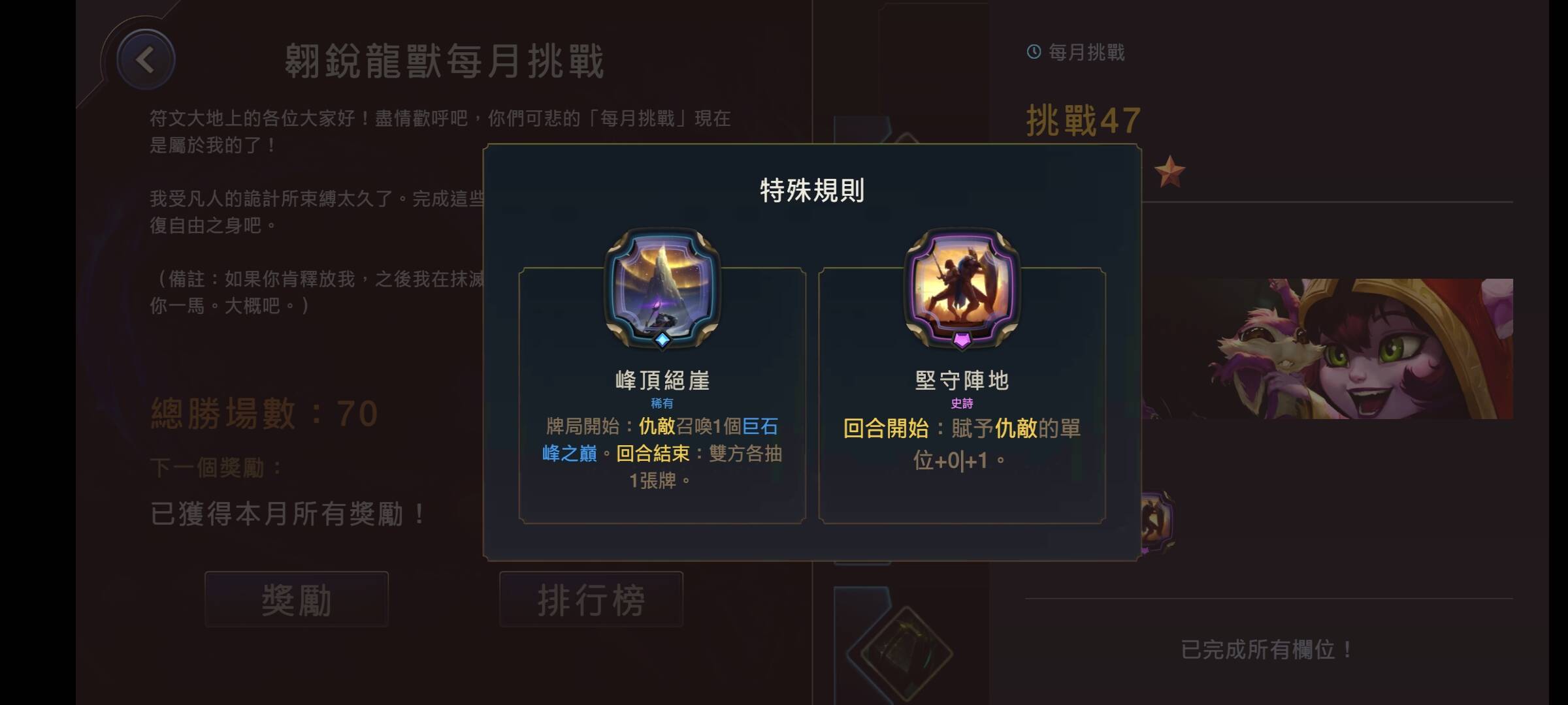 这个月的压力上的格外的早,你很难想象第18关就能出现巨神峰ez+刀妹的极品组合,看见巨神峰ez必须要尊重一下。回合开始的回蓝能让一些英雄用起来比较舒服,比如德邦兄妹。群友还推荐了狗熊,但我还没练。