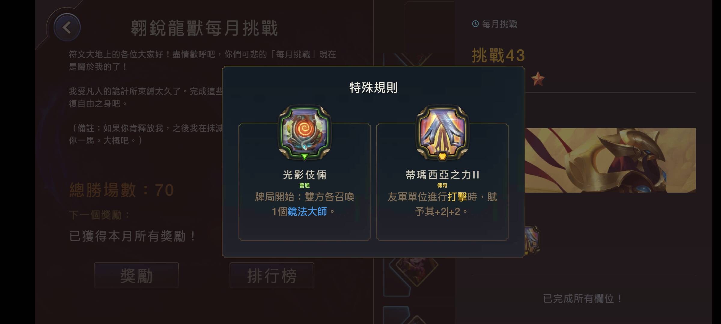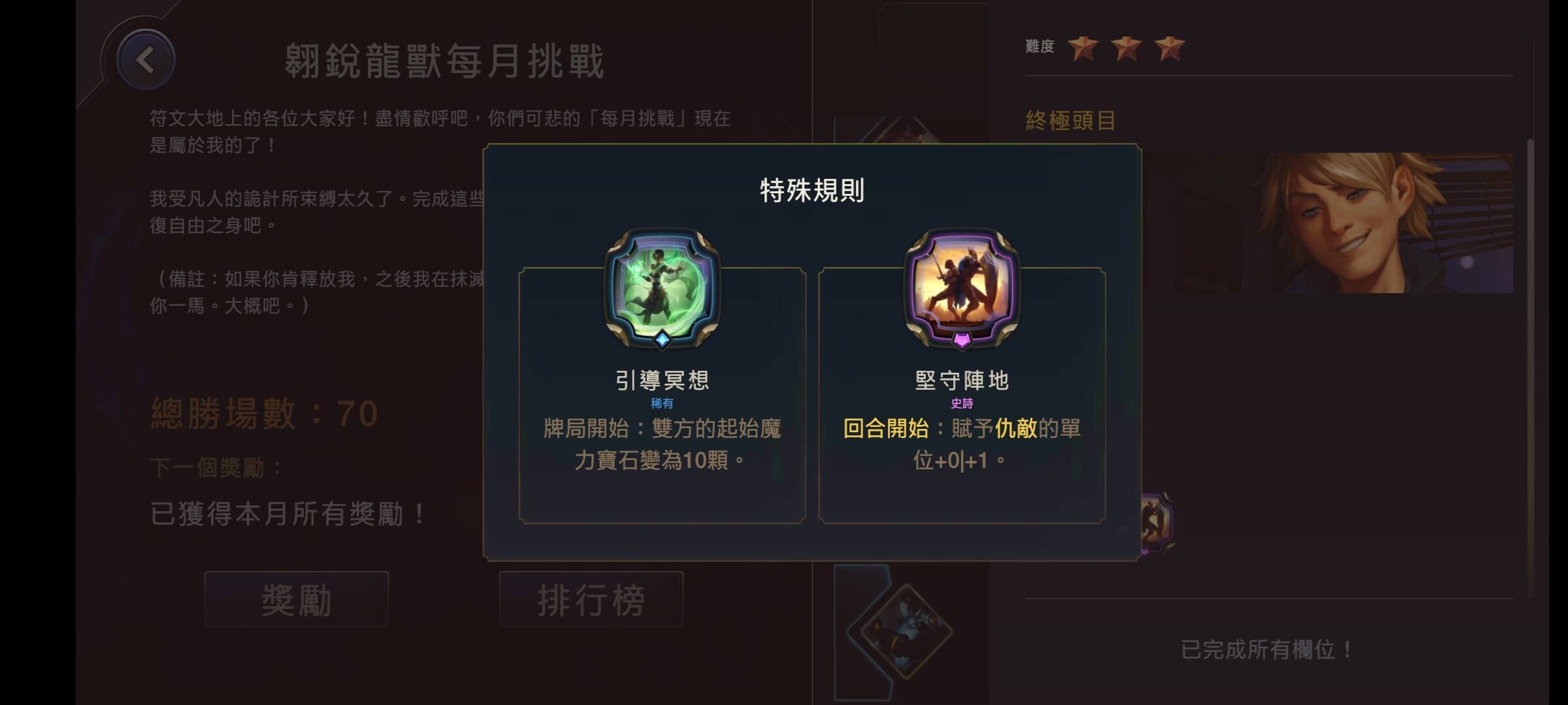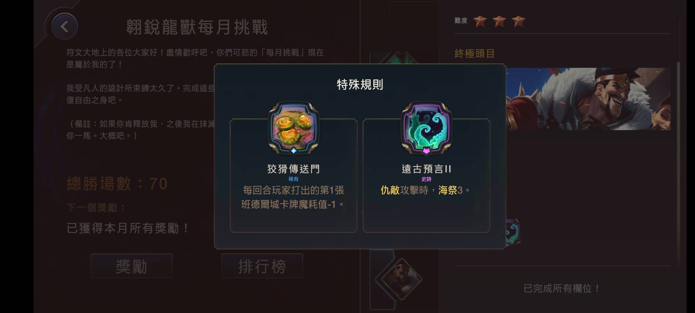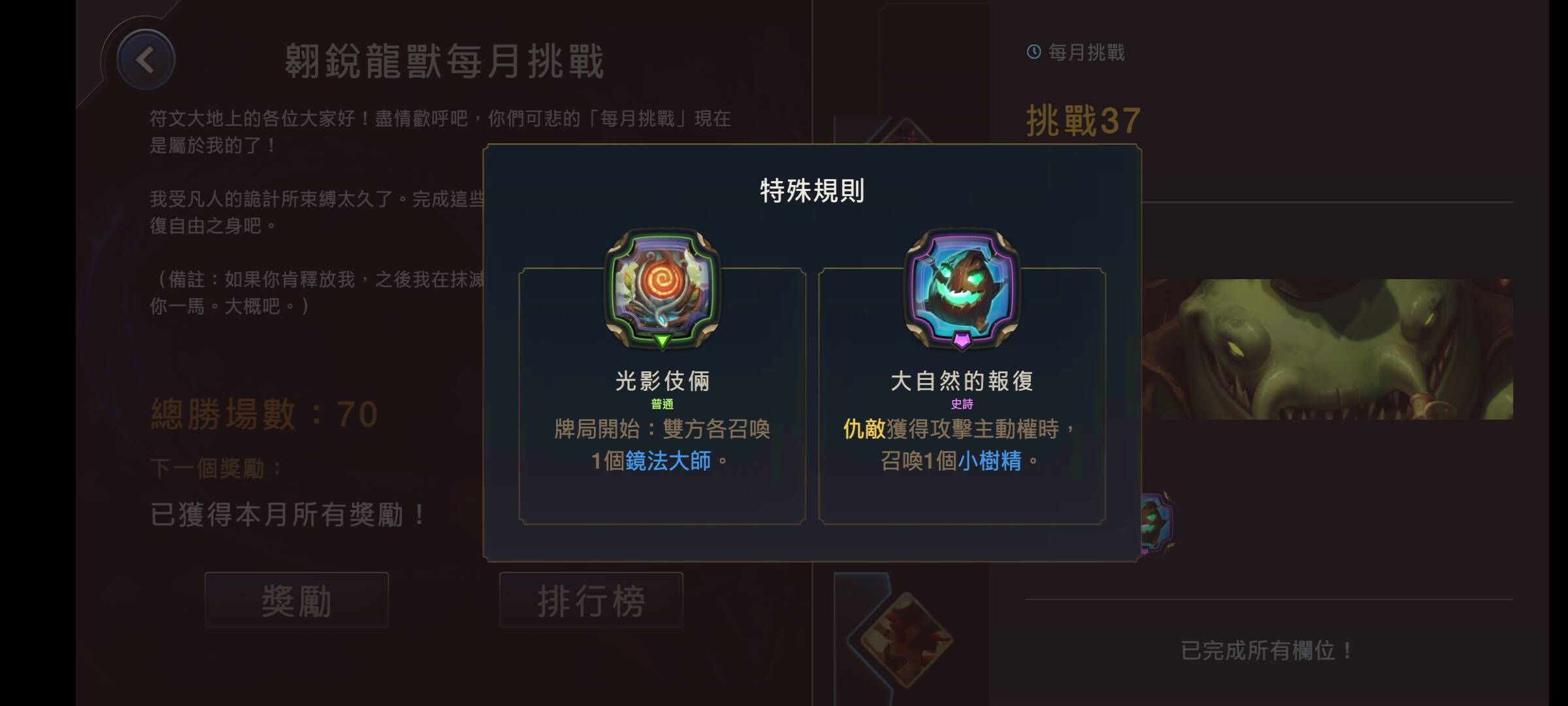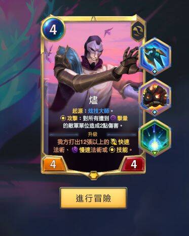 关底boss为泰坦,中途有一个金克斯,我看到镜法大师就使用了安妮,想给它两回合炸死,打金克斯时候很轻松,但被泰坦拖住了,差点翻车,故不推荐使用。有金色暗影能力的泰坦回复很强,很多英雄容易被他拖住翻盘。有镜法大师的局,还是推荐使用生成牌较多,能combo起来otk的英雄,最优选还是娜美、剑圣。