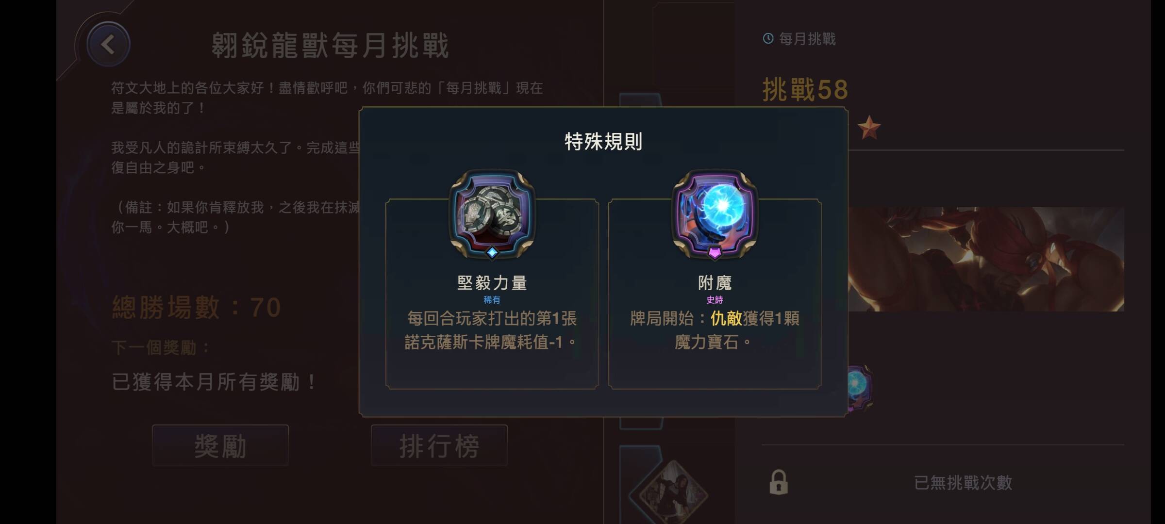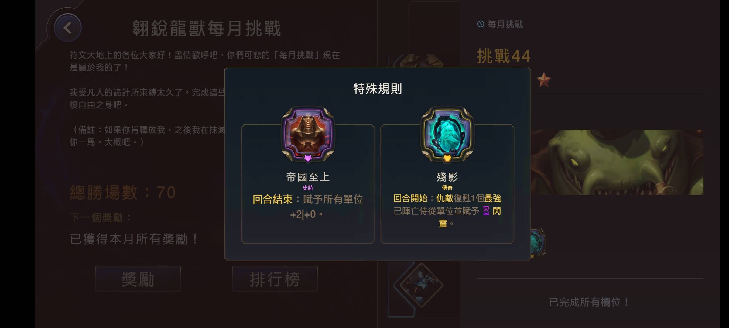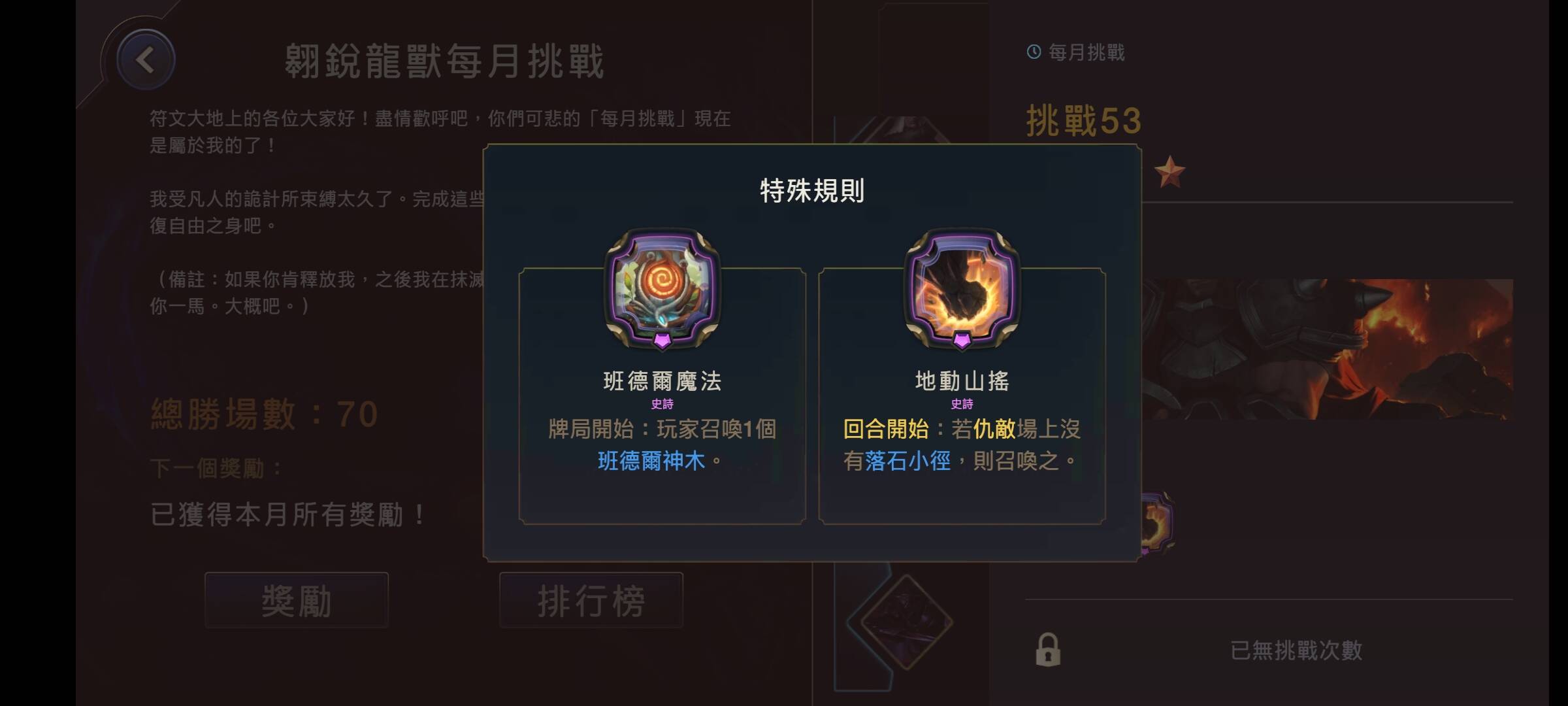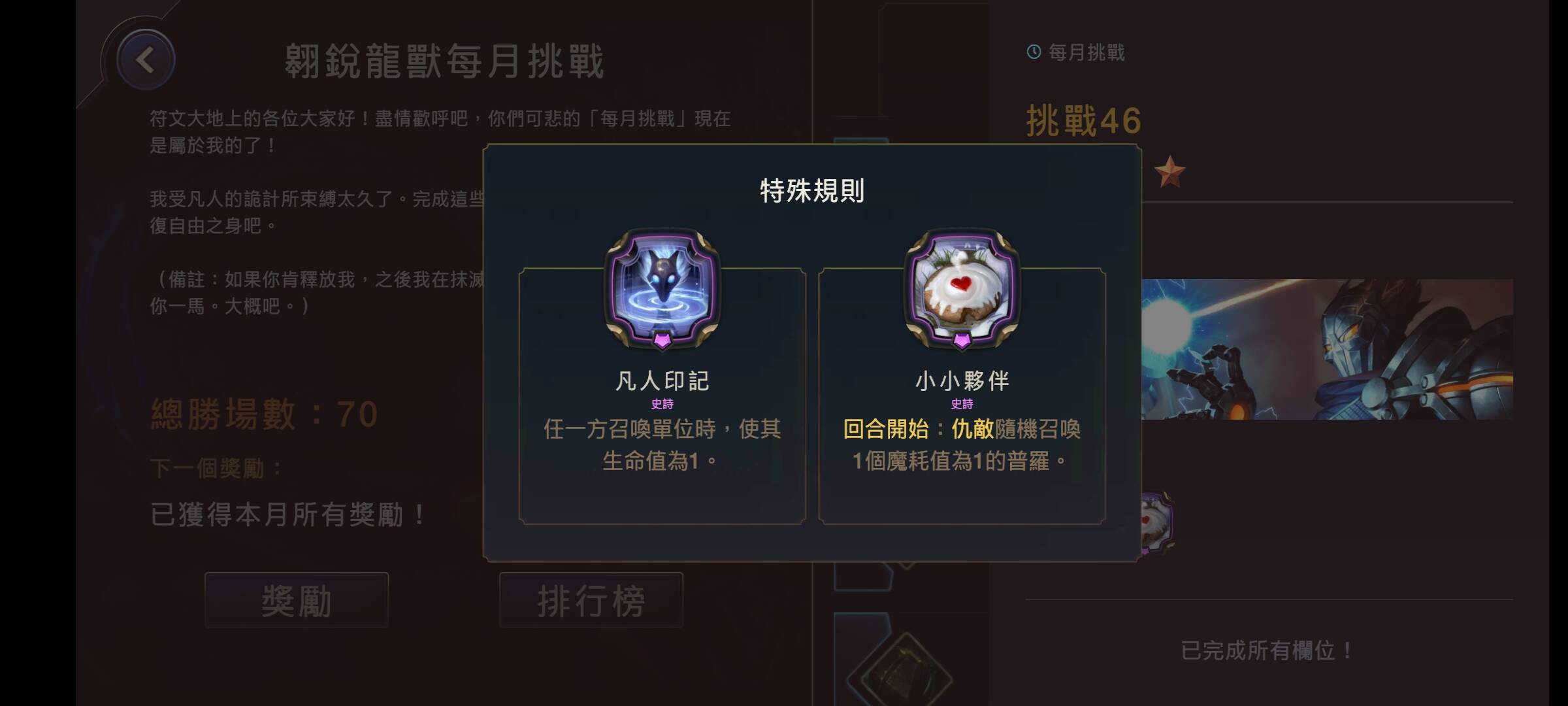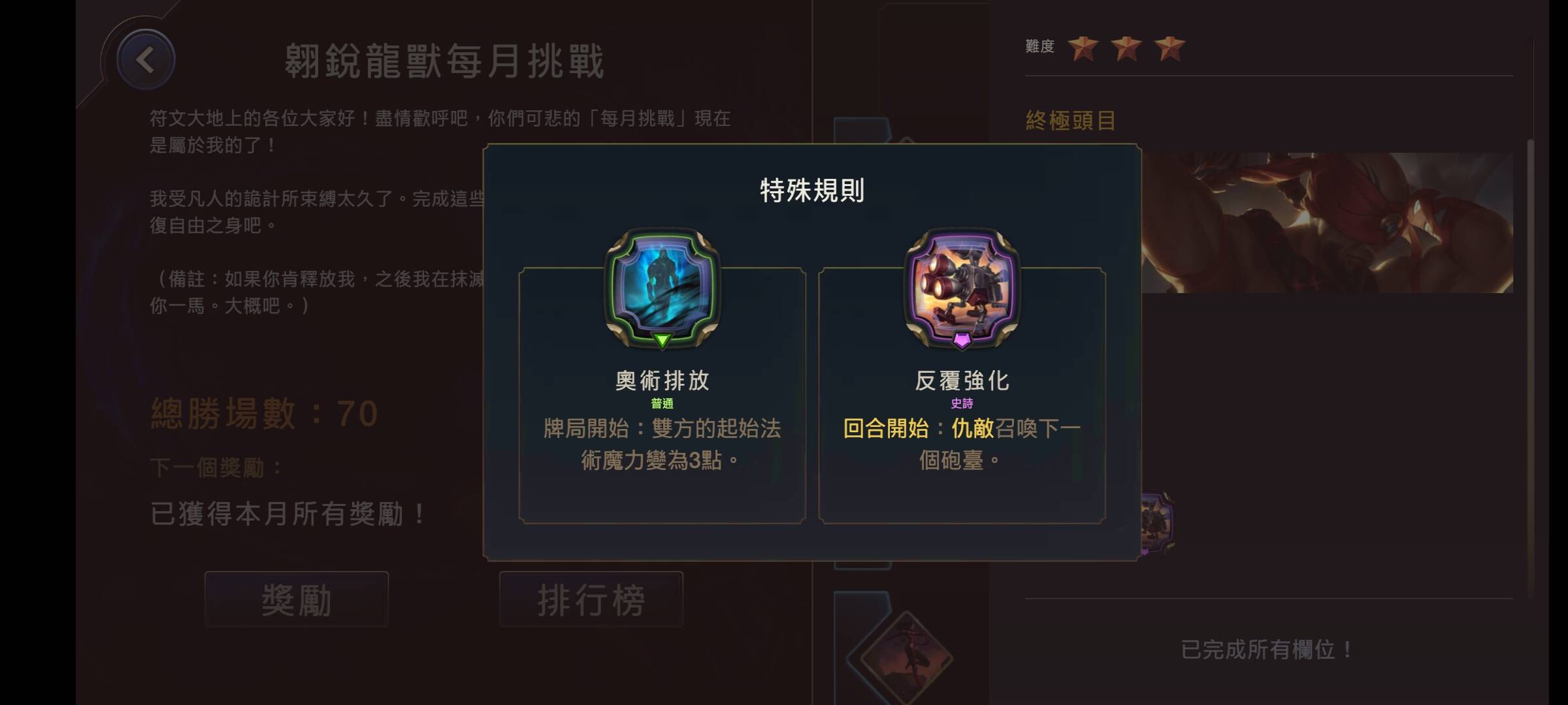 关底boss为泰坦,中途有一个金克斯,我看到镜法大师就使用了安妮,想给它两回合炸死,打金克斯时候很轻松,但被泰坦拖住了,差点翻车,故不推荐使用。有金色暗影能力的泰坦回复很强,很多英雄容易被他拖住翻盘。有镜法大师的局,还是推荐使用生成牌较多,能combo起来otk的英雄,最优选还是娜美、剑圣。