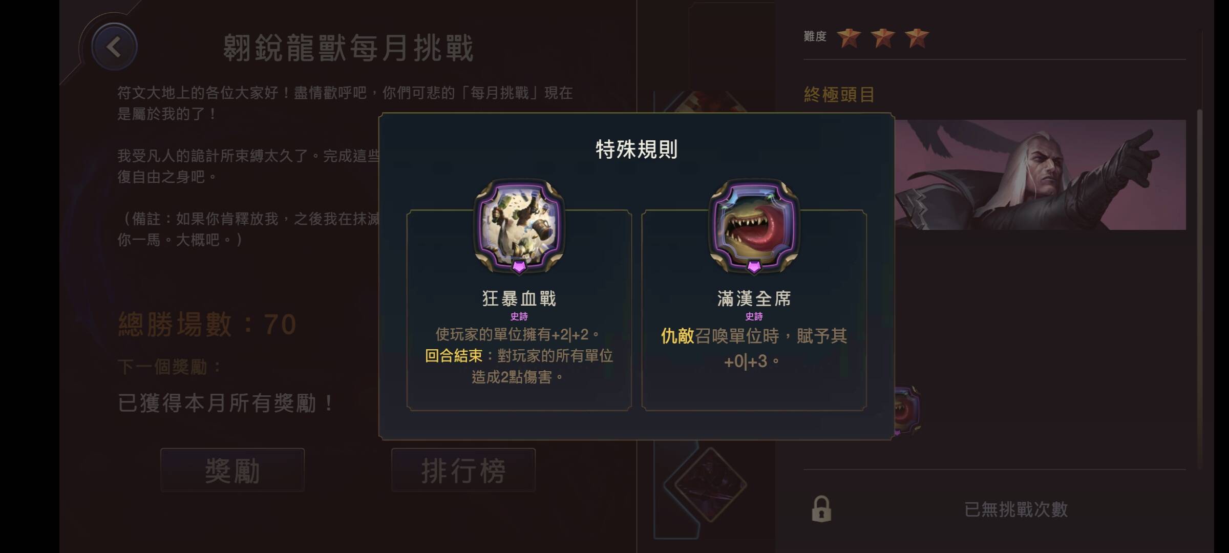 关卡难点在于狂暴血战的打2和斯维因的负伤打3组合起来,常规英雄很难站场,但对于塔姆来说纯是奖励。