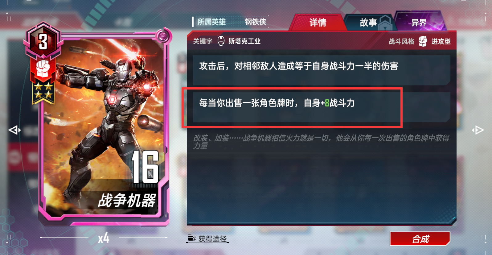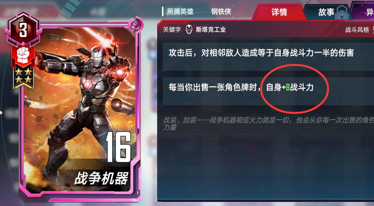1、打出角色卡,女雷神加攻击;卖出角色卡,战争机器加攻击,双向成长;
