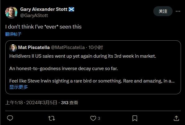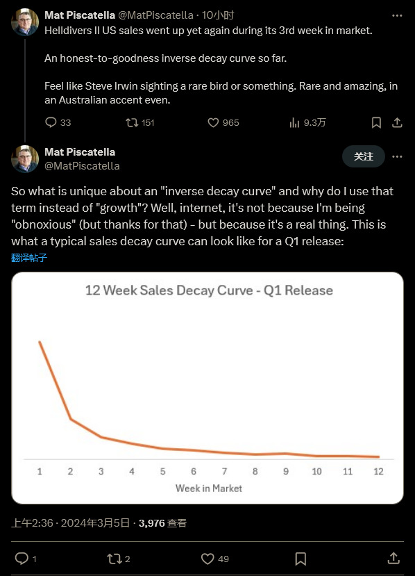 在推特上,行业分析师 Mat Piscatella 指出,《绝地潜兵2》打破了对游戏销量分析的传统观念,即游戏通常会在发布后第一周达到最高销量然后逐渐下降,知道重大更新或折扣等刺激销量增长。然而自 2 月 8 日起,《绝地潜兵2》一直没有任何的大型内容更新和大型的促销,但销量仍然在持续增长。他还展示了游戏销量正常的曲线图。