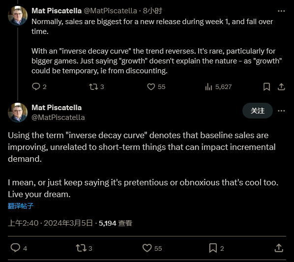 Piscatella 将游戏的销量称为“确确实实的逆衰减曲线”,他表示这非常非常罕见,并将游戏的表现评为“十分惊人”。他解释道:“通过‘逆向衰减曲线’,趋势会逆转。这种情况非常少见,特别是对于大型游戏而言。仅仅说说‘增长’并不能解释其本质——因为‘增长’可能只是暂时的,即来自折扣。”