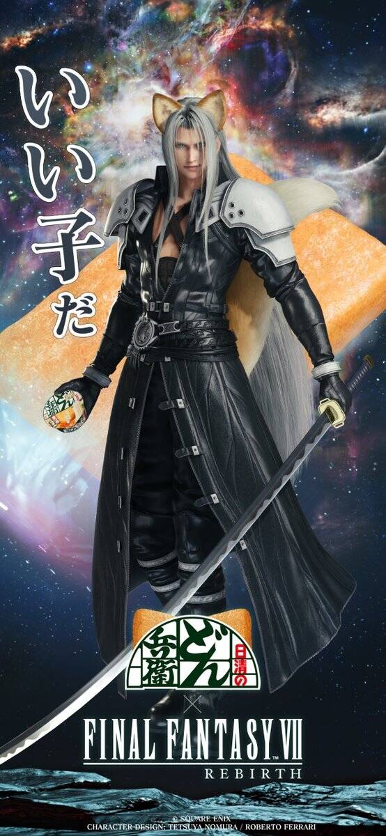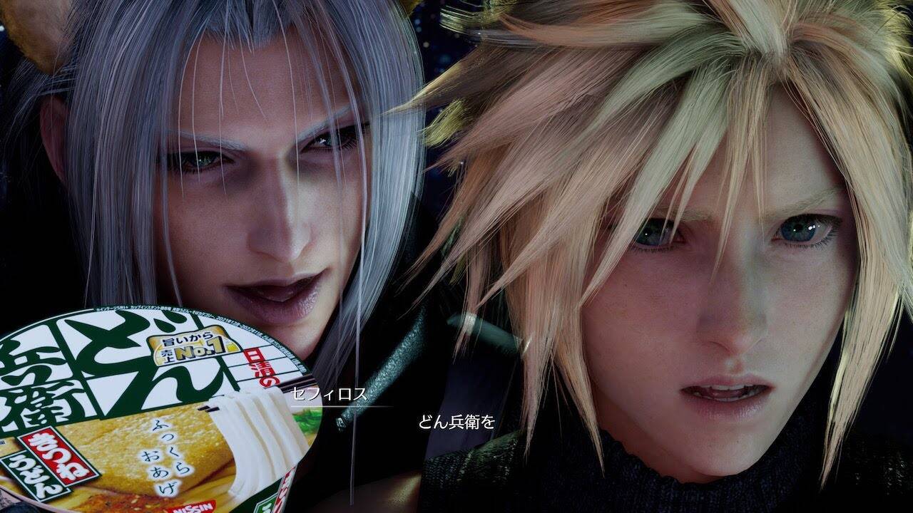 此前在《最终幻想7:重生》发布当日,日本速食老牌厂家日清乘机推出联动广告,以主角克劳德和狐狸形象的萨菲罗斯来宣传旗下产品“兵卫方便面”。