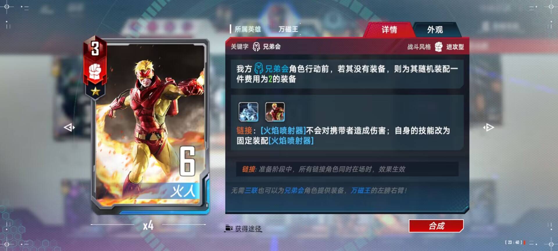 火人:×2,开链接;中期没找齐镭射眼链接时,用来过渡【界战争和红斗篷扛不住火人两梭子的】升5本,先用正义感召找冰人凑链接,再搭几个其他兄弟会角色,火力全开;怕火人启动不了,可以先买个2费齐塔瑞放在6号位挡一下;凤凰链接刚成型时,可以先留下火人,镭射眼开场被秒后火人还能打个输出,少掉点血;后期镭射眼培养起来,拿到隐匿无形,就可以卖掉火人了。