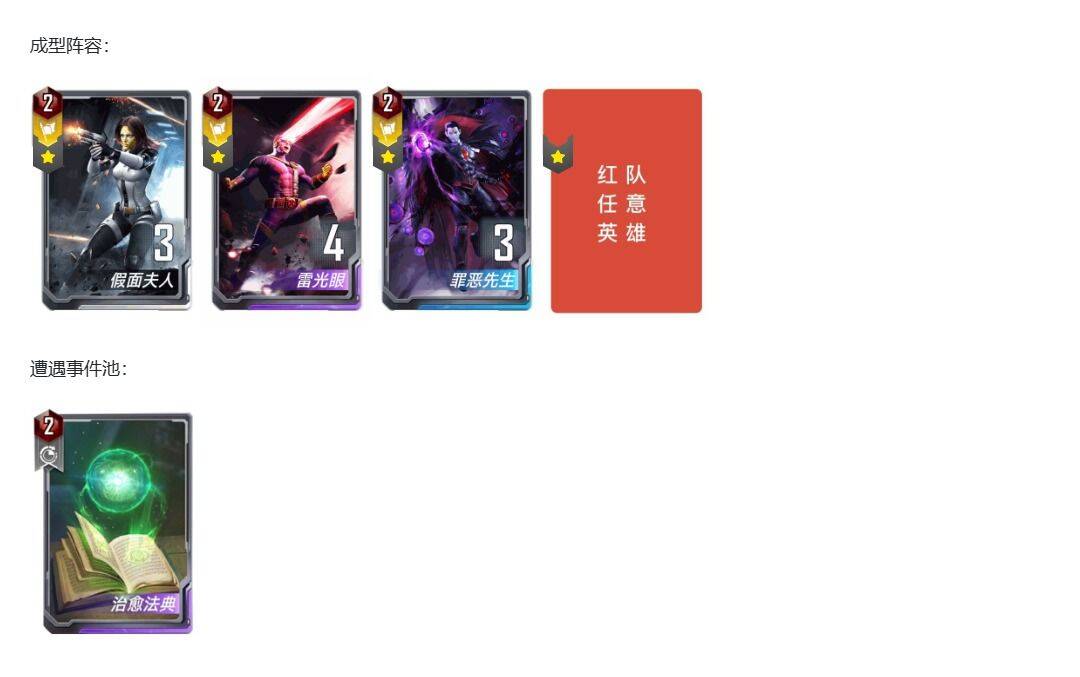 假面夫人:×4,提供血量,增加容错率;配合2张治愈法典,将血量转化为战斗力,增加前期稳定性,上两个假面夫人,加的战力会更多【可以遭遇卡池放2张治愈法典,场上放2张夫人升本,商店再锁1张夫人】