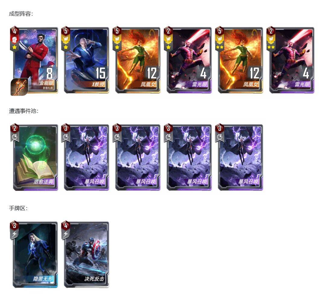 x教授:1张,爆发的薪材;优先觉醒x教授,稳定搜索x战警核心牌;1张即可,多了卡手,会卡住x教授的感召,降低找到其他x战警核心牌的概率;视情况扔掉,比如打决赛时。
