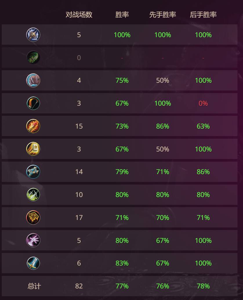 之前还存在的弑君贼、剽窃贼基本销声匿迹了,所以牛里的偷刀也换成了第二个aoe防快攻,可以根据自己的环境进行调整。最后附上各职业对战胜率。祝大家早日上传🤭🤭