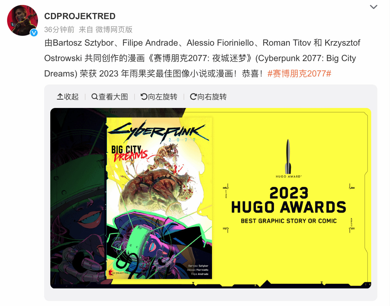 其中比较著名的是荣获2023年雨果奖最佳图像小说或漫画奖的漫画《赛博朋克2077:夜城迷梦》,而CDPR官方也与黑马漫画(Dark Horse Comics)合作推出了多部衍生漫画作品。