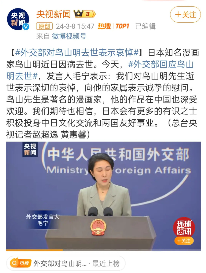 3月1日,鸟山明因急性硬膜下血肿去世,直到头七,也就是今天,日本方面才公开讣告。先生一世低调,葬礼仅由近亲参加,遗愿也谢绝外界吊唁、奠仪、供品、献花等其他代表慰问的举动,恳请外界不要对家人进行采访,希望安安静静离开。