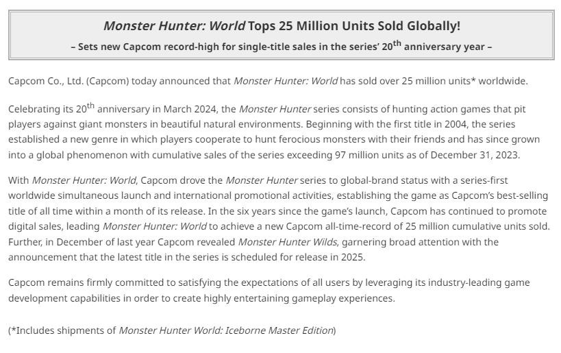 3月12日,卡普空宣布《怪物猎人:世界》全球销量已突破2500万,使其成为了卡普空有史以来销量最高的游戏。截止到2023年12月31日,《怪物猎人》系列累计销量已超过9700万。