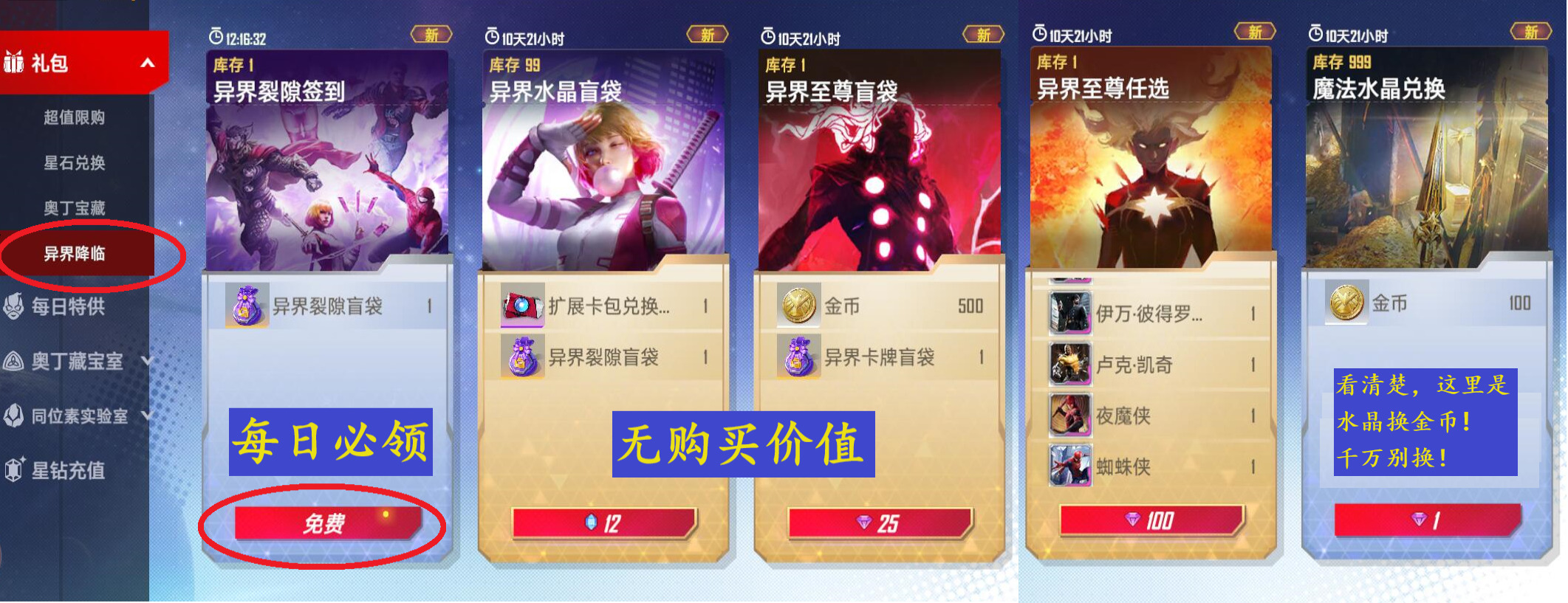 注意:血魔、套娃其他组件齐全了才考虑兑换沙魔和蜘蛛侠,一张其实够用了。