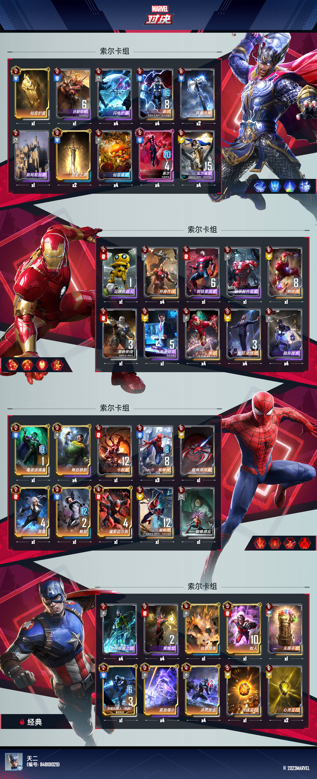 核心卡:粉索(剑) 新索(斧子) 女武神(后期上),黄蜂女蚁人(这俩一般可以留到最后,如果实在没格子,比如需要夜巡寿老或者夺命,可以卖掉),屹立版沃斯塔哥(有女武神可以卖掉,没拿到女武神还正好多一把斧子可以给他,加速新索叠甲), 蜘蛛侠(超级核心,必留,带嘲讽盾)