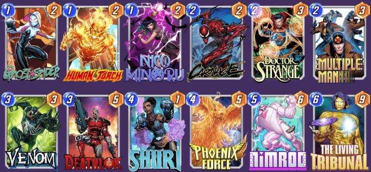 【凤凰之力】的热度同样受到比赛影响,直接从十八线不入流一跃而升至天梯头部(尤其是无限高分段)。这套卡组最大的特色在于赢点非常明确——【分身人】+【凤凰之力】+任意摧毁牌,只要来了一套就能果断snap,不来也能立刻撤退,大大避免因“看一眼”而丢分的尴尬情况。但这套卡组对牌手熟练度要求较高,【分身人】也不是唯一的复活选项,还需各位多加练习和发挥想象力。