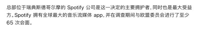 他们还暗搓搓地说 Spotify 和欧盟委员会有 py 交易: “ 在调查期间与欧盟委员会进行了至少 65 次会面。 ”