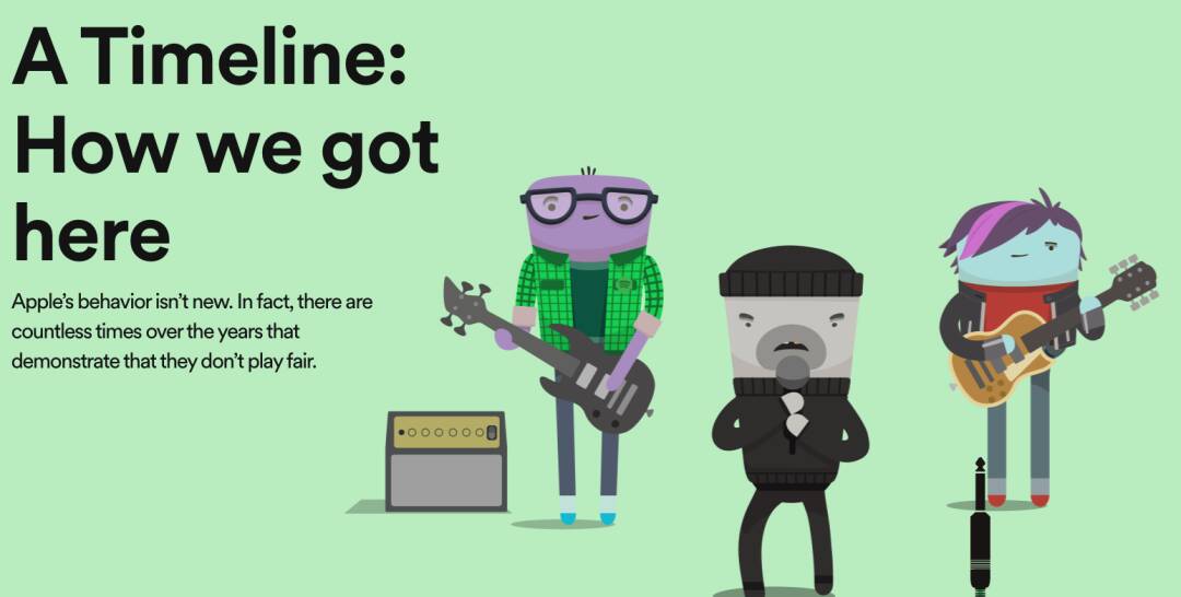 Spotify 还牵头特地做了叫 “ 是时候为公平而战( Time to Play Fair ) ” 的网站,里面每个角落都是对苹果的控诉。