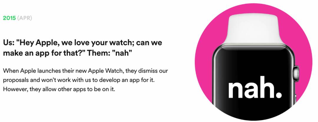 当苹果推出 Apple Watch 新品时,还故意卡 Spotify 时间,拖延他们制作手表端 App 的速度( 苹果方面称大量应用开发进度相仿,并没有故意刁难 Spotify )。