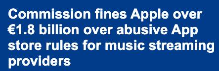 于是在 2019 年, Spotify 终于忍无可忍,就把苹果的三两事儿全捅到了欧盟衙门那,前两天罚 20 亿美元,正是这次上诉的处理结果。