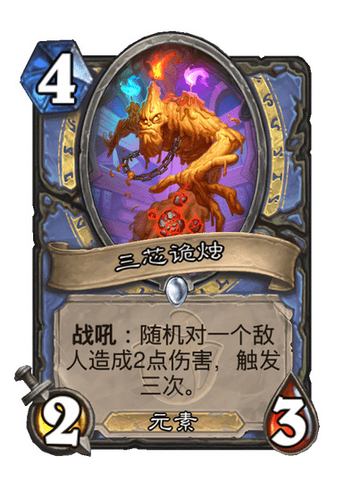:随机对一个敌人造成2点伤害,触发三次。