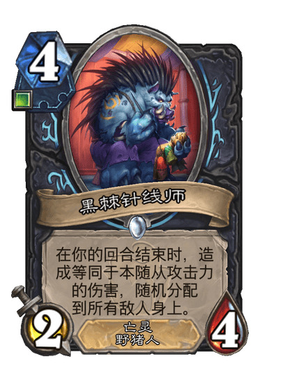 在你的回合结束时,造成等同于本随从攻击力的伤害,随机分配在所有敌人身上。