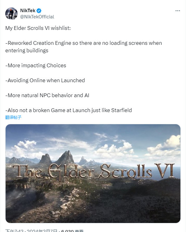 一名网友对《上古卷轴6》的希望: