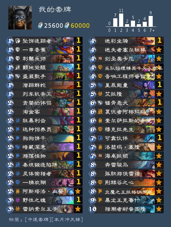 去年刚玩的时候以新手摊牌为基础慢慢攒出了这套超贵的卡组。最近版本回调,虽然只能爽一个星期,但是现在玩着太爽了。猎人回调的牌都是关键质量牌,三个灵种超模的身材,野兽伙伴也召唤的是复制。王子的40血再加上猎人前中期铺场都很强,不虚快攻尤其是骑士;伙伴召唤的两个霸王龙不论16血32血都是超强终结手段;基本不太怕怕疫病,因为单卡每个都有质量。分段不高,从传说16000开始10-2一路上分,玩下来感觉缺点是过牌太难,前期如果卡手会很难受,输的两把都是前期没节奏。我有想过会不会不要宇宙的普通王子野兽猎会更强,打算抓紧试试。由于我之前把导演分解了所以没带,有的可以带上打到后期应该有用