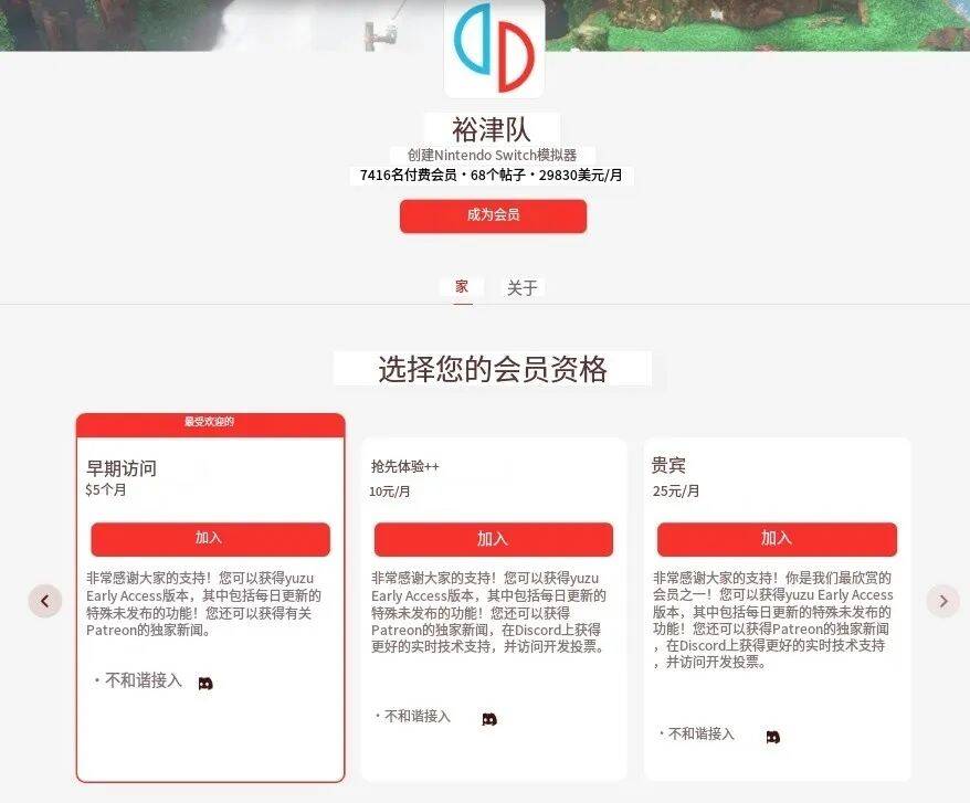 除了潜伏在Yuzu模拟器社区中,任天堂法务部还搬出了他们靠这个盈利的直接证据,Yuzu模拟器在国外的创作者订阅平台Patreon上开通了付费订阅通道。