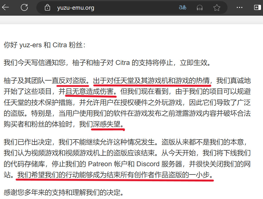现在打开Yuzu官网,只能获得这封公开信,信中写道诸如“一直反对盗版”、“基于对任天堂主机、游戏的善意和热情才启动了Yuzu模拟器”、“无意造成伤害”、“深感失望”、“但愿这次举动能‘成为推动盗版终结的一小步’”,从这些话联系Yuzu团队在上诉前的突然和解来看,他们开发模拟器的初衷可能真的不是为了抢夺任天堂的生意。