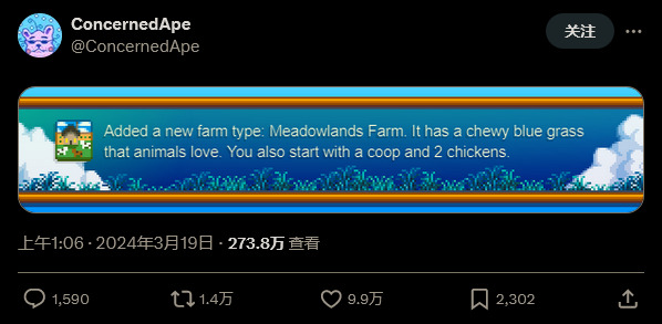 在推特上,他发布了一张游戏内的截图,描述新农场将名为“草原牧场(Meadowlands Farm)”,将包含“动物喜欢的耐嚼的蓝色草”,玩家一开始将拥有“一个鸡舍和两只鸡”。