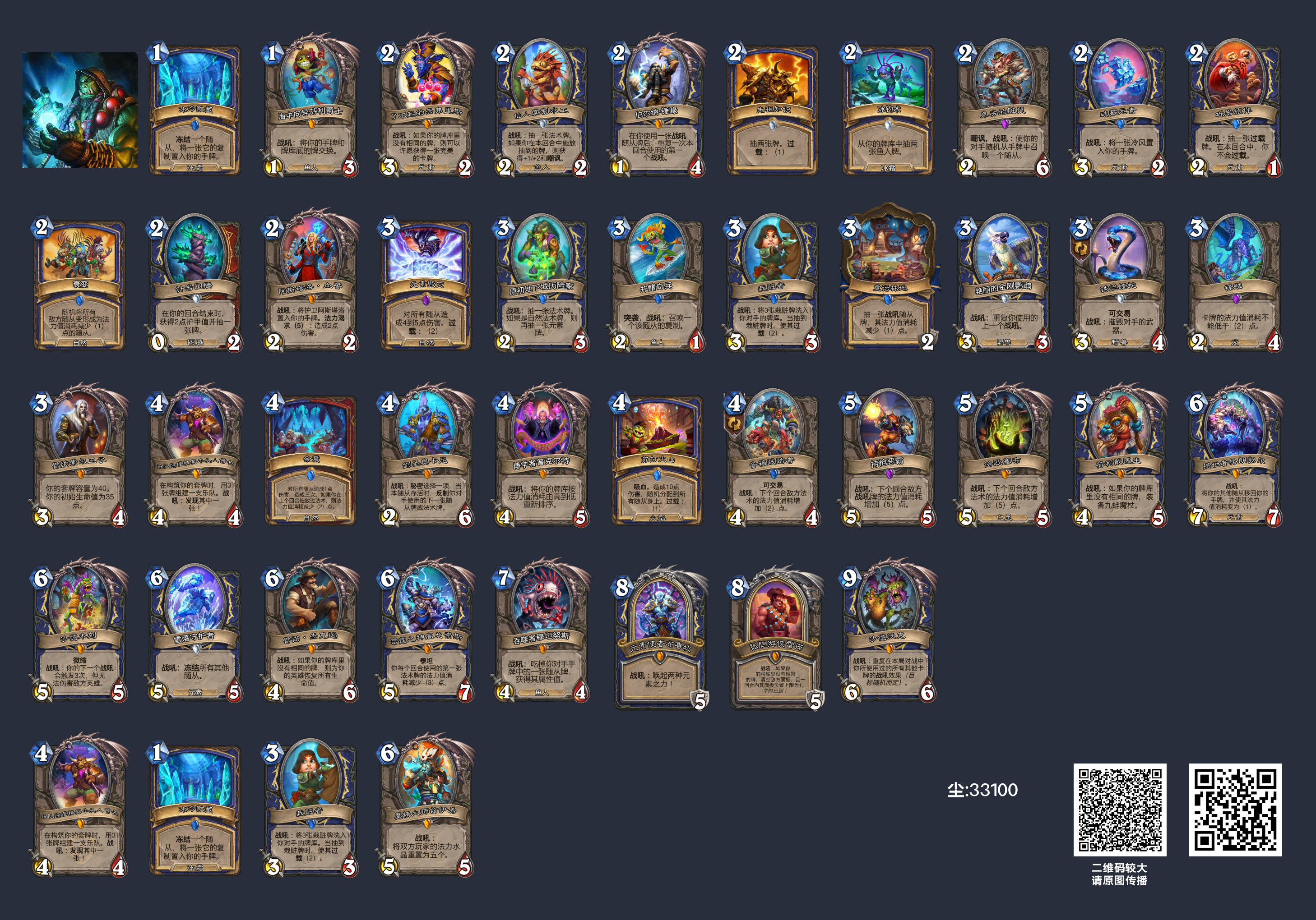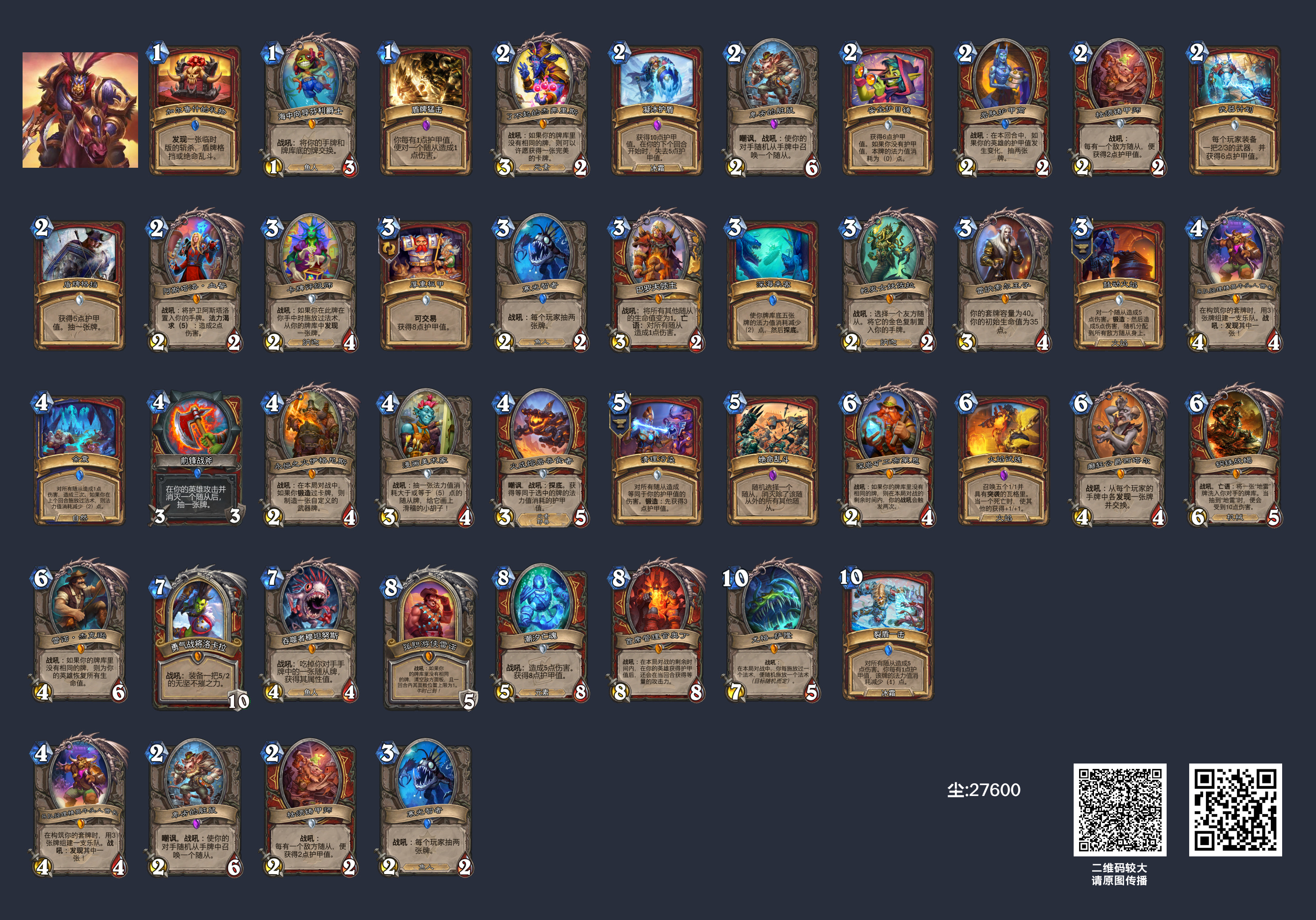 来自Sagiri的一套40宇宙战吼萨,它使用这套卡组在3.18登顶,卡组原型来自贪狼(另一位吼皮),但在新版本后,Sagiri没有打天梯,不过它给了一套来自贪狼的新40宇宙战吼萨构筑,质量有保证,开到沙德木刻的老哥可以尝试,构筑如下:
