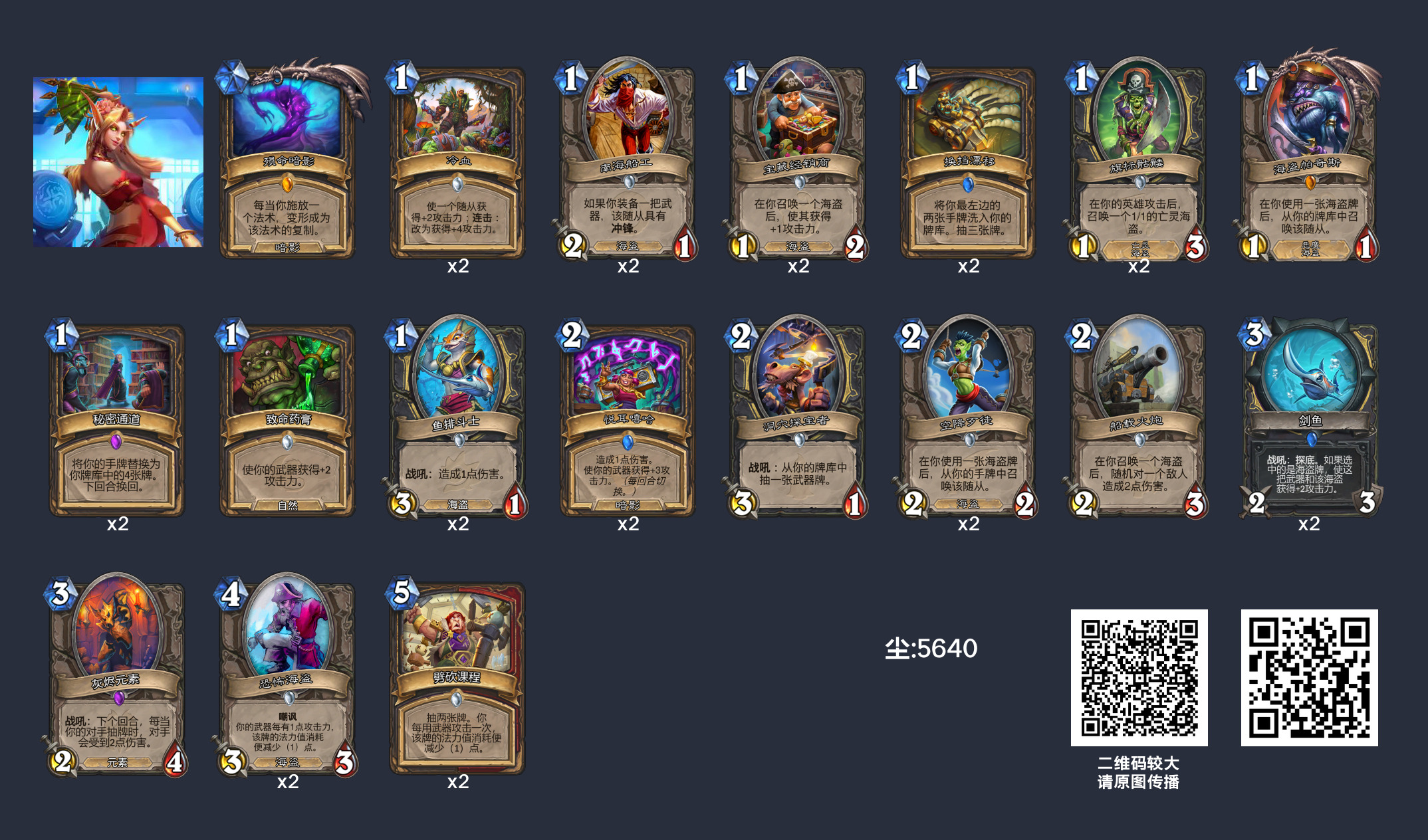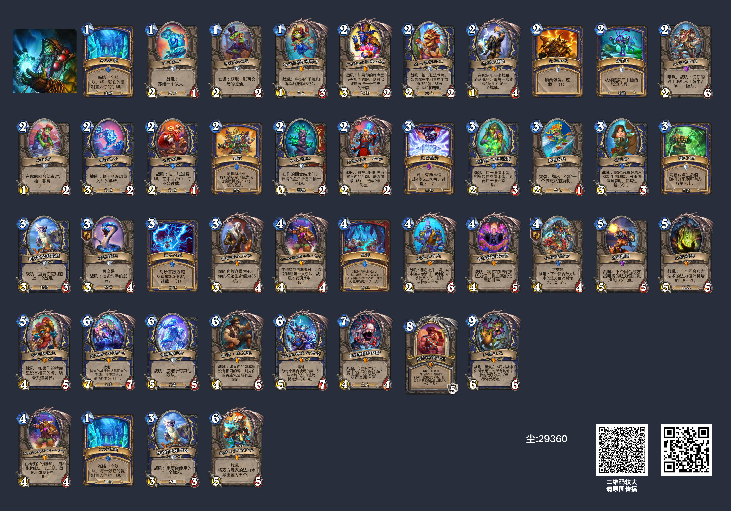 今天的卡组有:剑鱼贼、40剑鱼贼、偶数萨、40战吼萨、奇迹心火牧、40宇宙战、心火开门龙牧、30宇宙暗牧、宇宙猎。