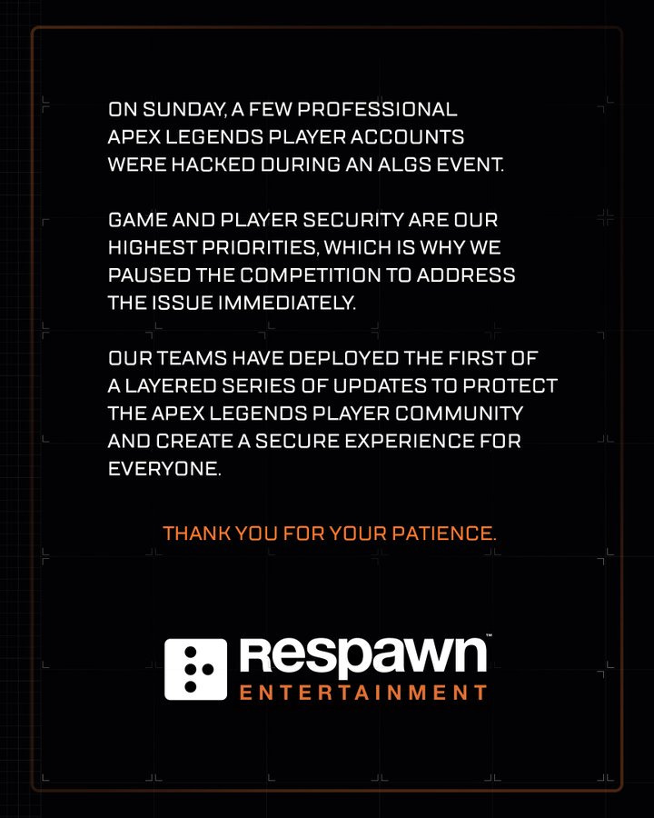 《Apex英雄》开发商重生工作室日前就上周末在游戏的全球系列赛 ALGS 北美地区决赛期间发生的黑客入侵事件发布了官方声明。