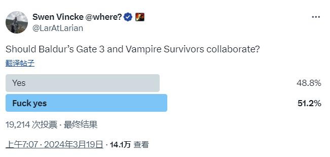 截止到投票结束,已经有1.9万名玩家参与投票,其中51.2%选择了“Fuck Yes”。此外,在这则推文的评论中,Swen Vincke还补充了一张他与《吸血鬼幸存者》作者Luca Galante的合照。