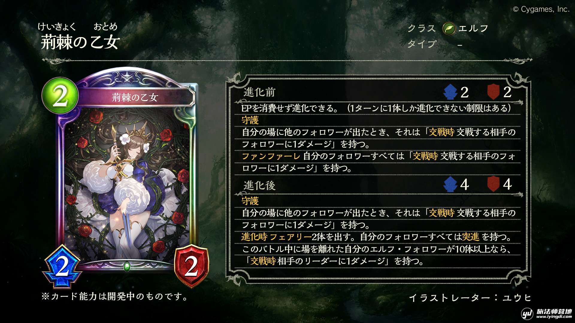 进化时 召唤2个妖精到战场上。给予自己的随从全体突进效果。如果这场对战中自己已离场的精灵随从数量为10个以上,则会获得「交战时 给予敌方的主战者1点伤害」效果。