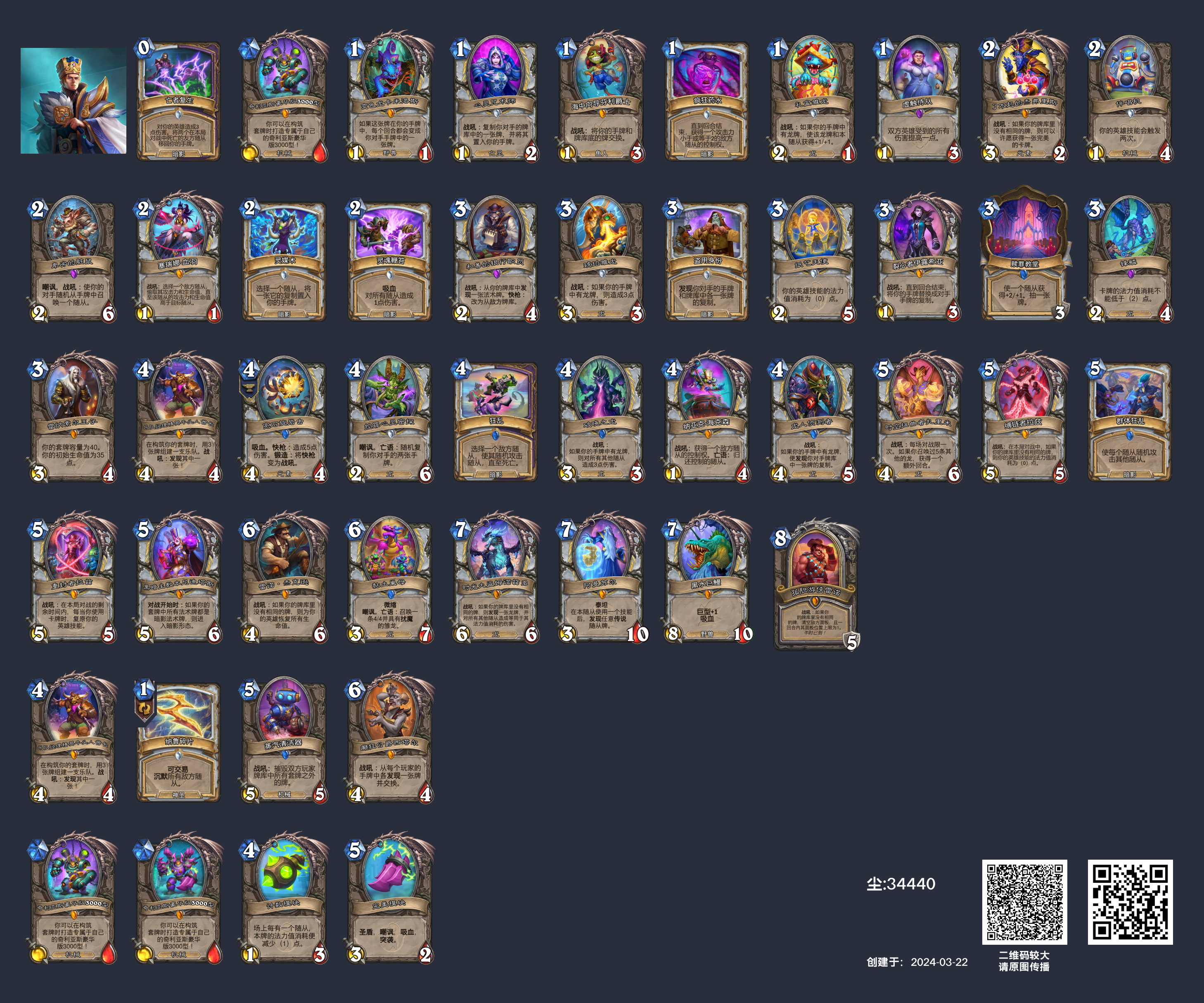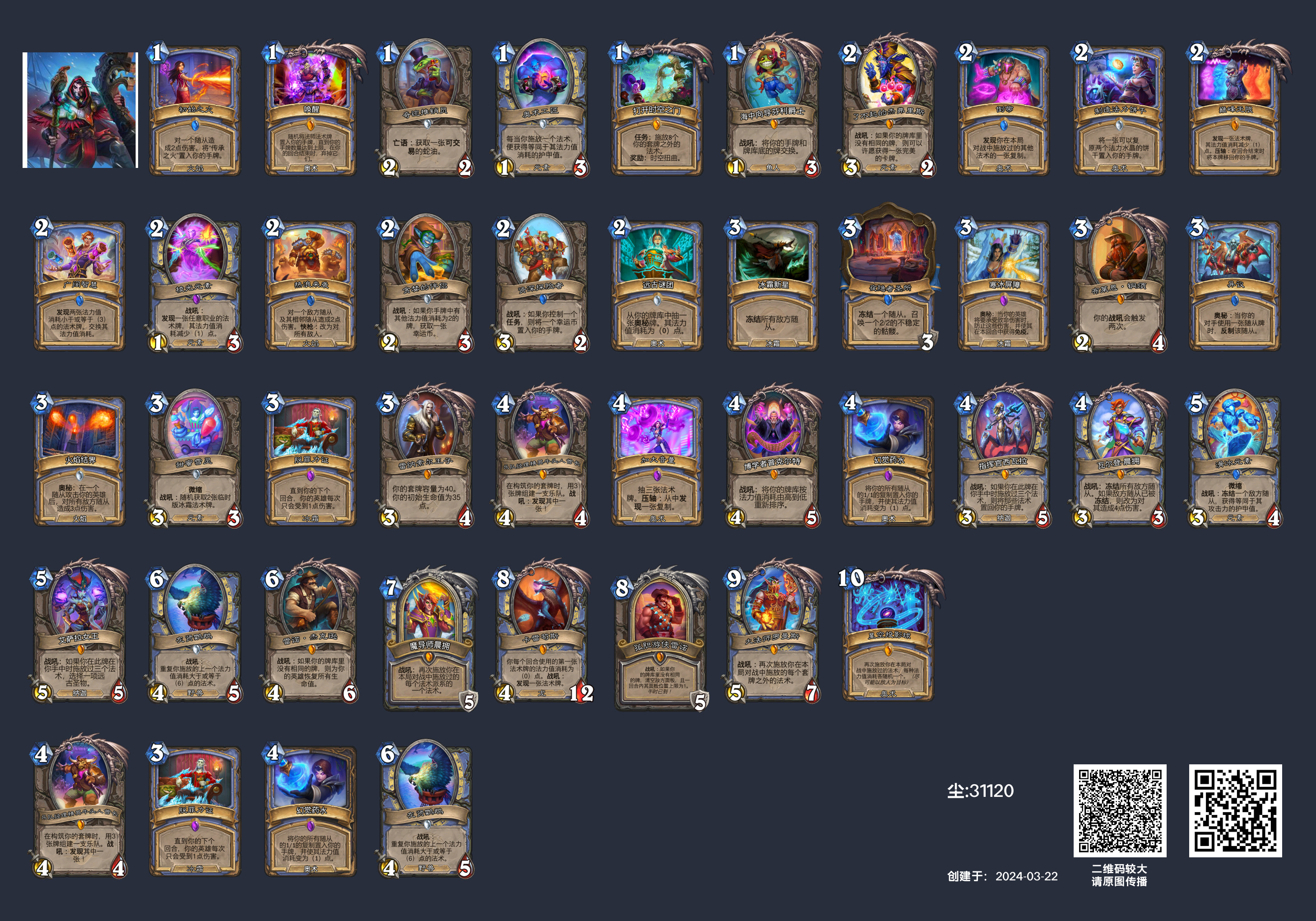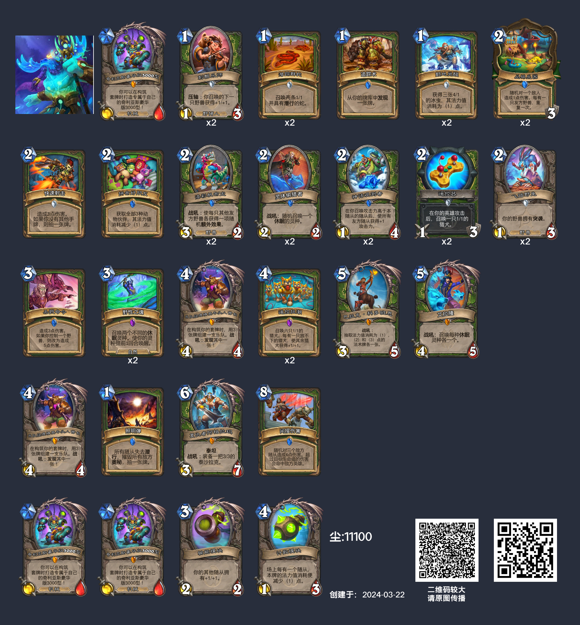 卡组构筑借鉴了标准的思路,实际上就是标准卡组加入了回调的灵种体系,休眠的灵种配合遥控狂潮可以稳定在狂野环境下打出4费一地3344的场面,而这个场面在狂野环境下也是极具威胁的。(我怀疑标准一张不改在狂野也能打很高)