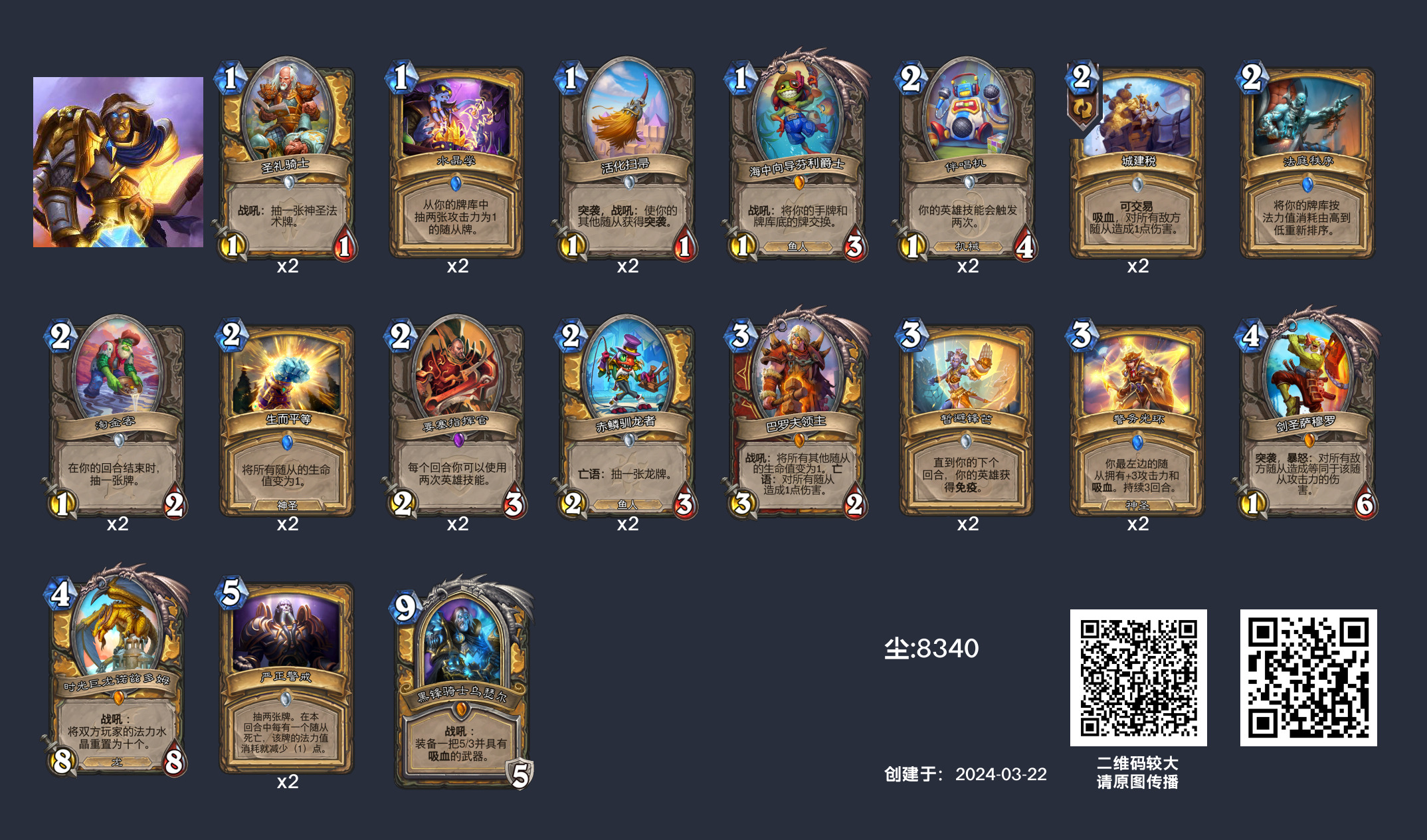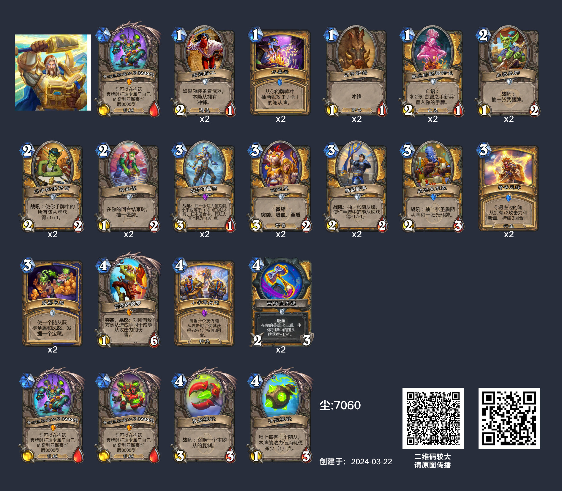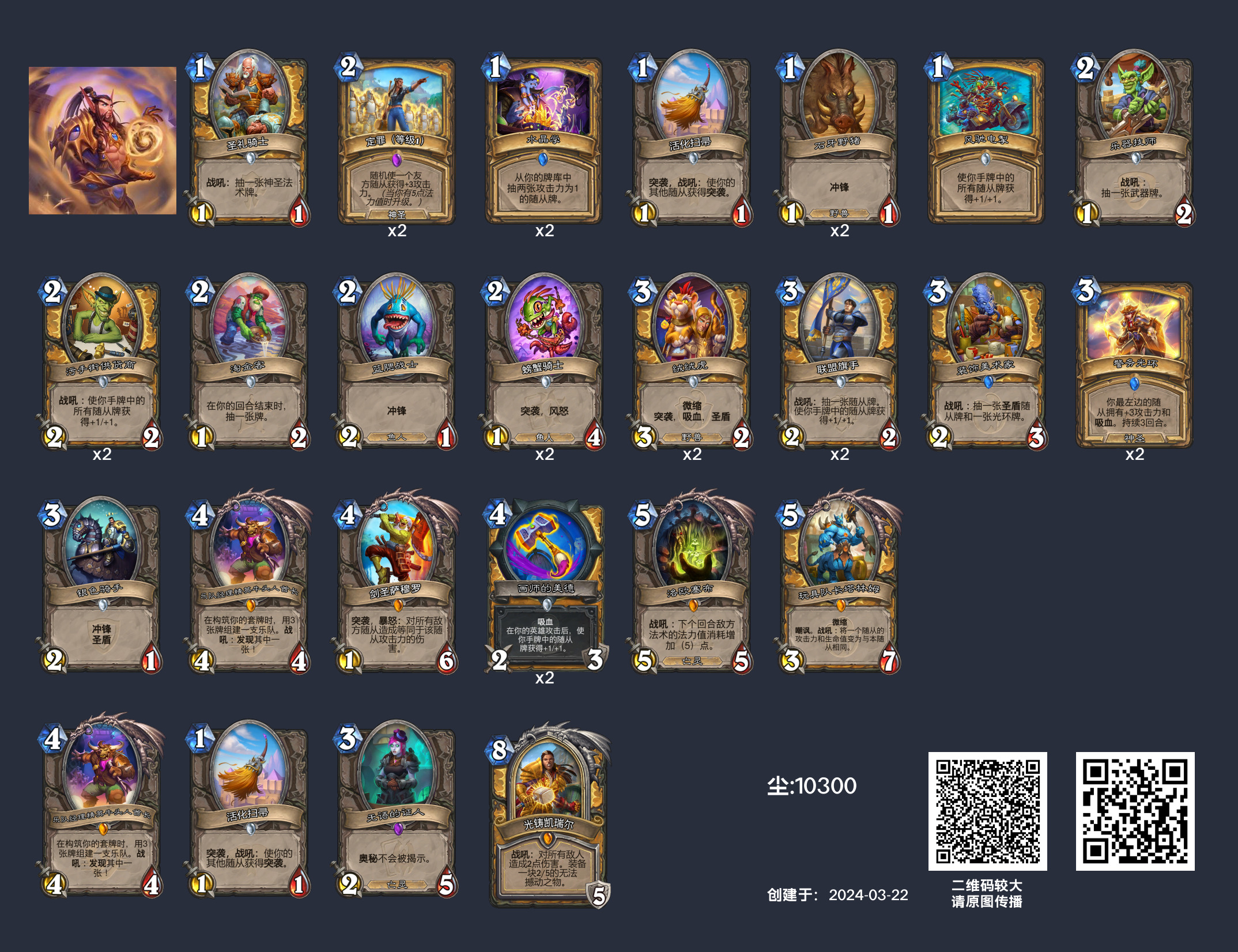 卡组构筑借鉴了标准的思路,实际上就是标准卡组加入了回调的灵种体系,休眠的灵种配合遥控狂潮可以稳定在狂野环境下打出4费一地3344的场面,而这个场面在狂野环境下也是极具威胁的。(我怀疑标准一张不改在狂野也能打很高)
