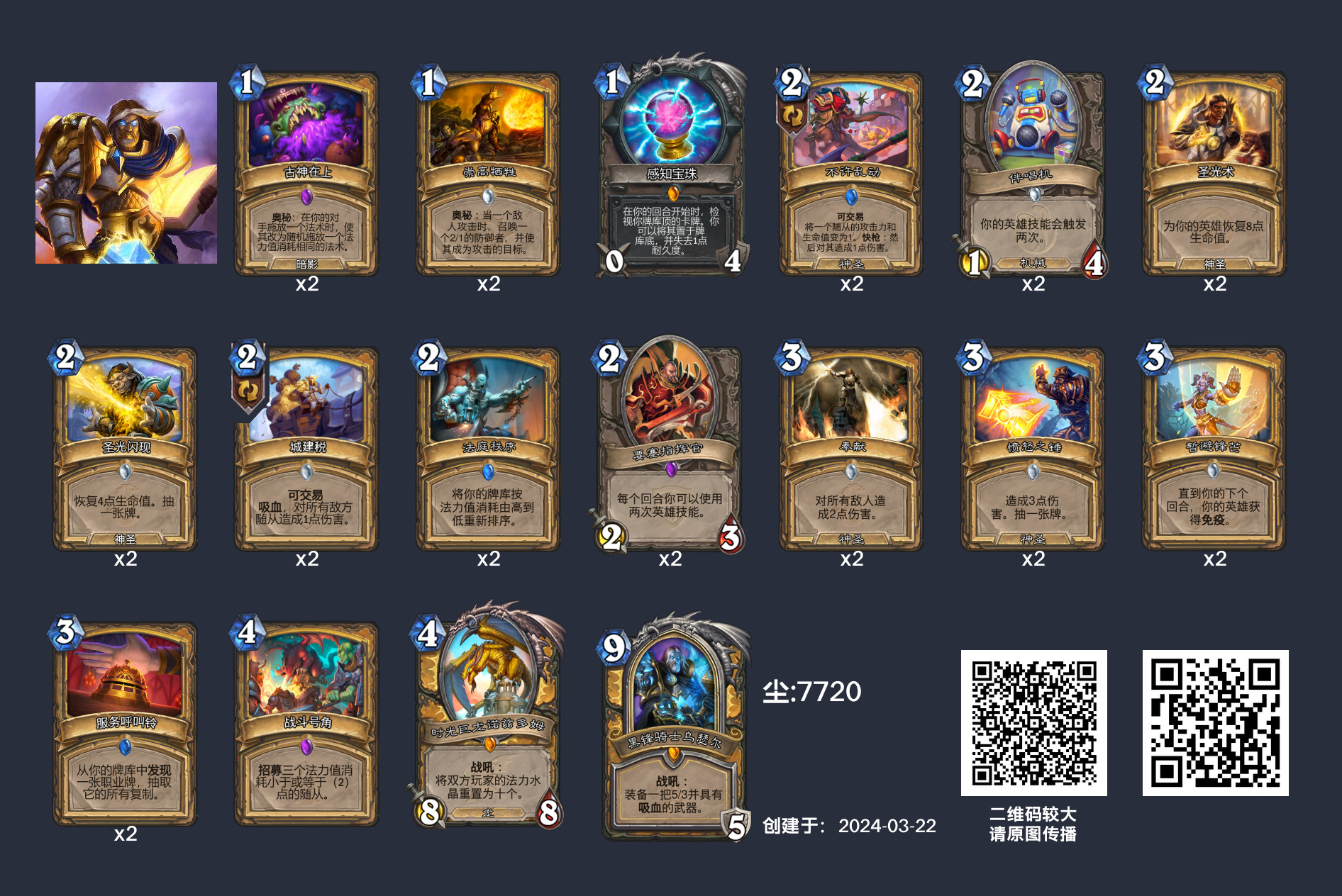 由于最近忙于找工作,对局场次较少,但是对20号首日的美服环境来看,这套卡组还算不错,可玩性也很高,经常以不同的方式赢下对局,对战元气骑,奇迹贼,快攻暗牧等一众卡组都有着不小的优势,我一直认为控制形态的宇宙暗牧内战能够通过从对手获取走A组件,并不应该很劣开30宇宙暗牧,并且40血也提高了对手斩杀的难度,一旦拖入后期,30宇宙暗牧便资源匮乏无法继续对局。