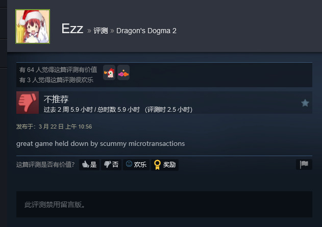 部分微交易有购买次数限制,但是另外一些可以无限量购买。Jez 表示:“考虑到《龙之信条2》是一款售价 70 美元(国区 348 元)的单人 RPG 时,玩家门(往轻了说)……不是很高兴也就不足为奇了。”