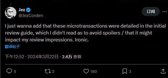 他在推特上承认,最初卡普空给的评测指南中确实提到了这些微交易,但是为了避免剧透他并没有读评测指南。