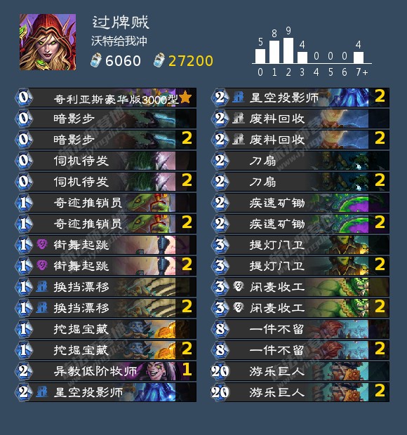 3.4-6费:4费开始进入我们卡组的强势期,在保持手牌尽量多的情况下,打出提灯门卫,到这里正常的情况下巨人一般还需要5费左右,所以若此时手牌中有暗影步的话,可以暗影步回收提灯门卫然后再次打出,这也是为什么我们一般4费启动的原因,提灯门卫+暗影步+提灯门卫=4。其中如果有一件不留的话普遍应该是0费可以直接打出。巨人出场后比较关键的牌是街舞起跳,星空投影师加暗影步的组合,和巨人地位相同的卡是奇利亚斯,场面上有随从后奇利亚斯可以减费到比较低费,也可以用星空投影师来复制来膨胀场面。